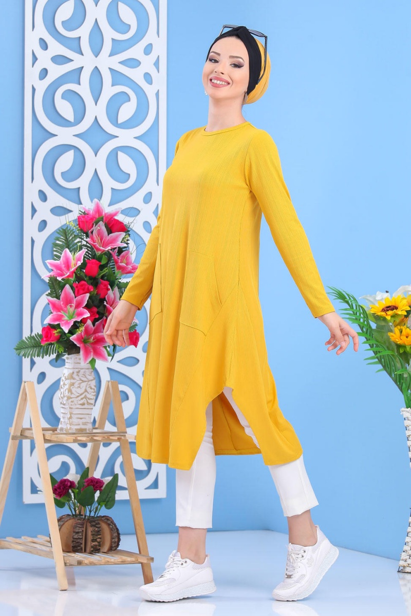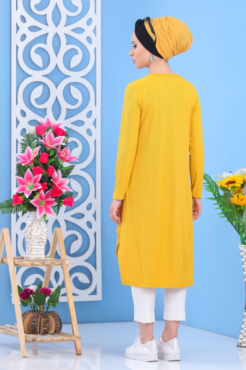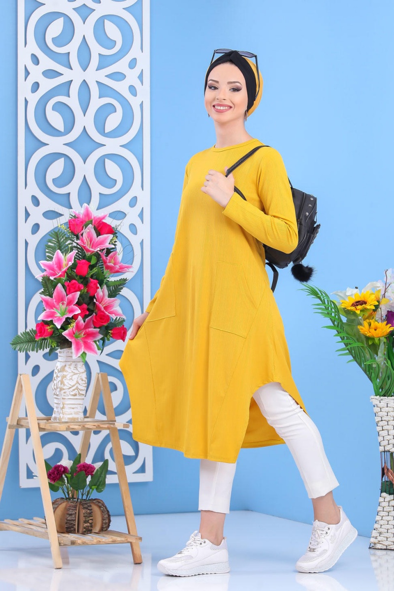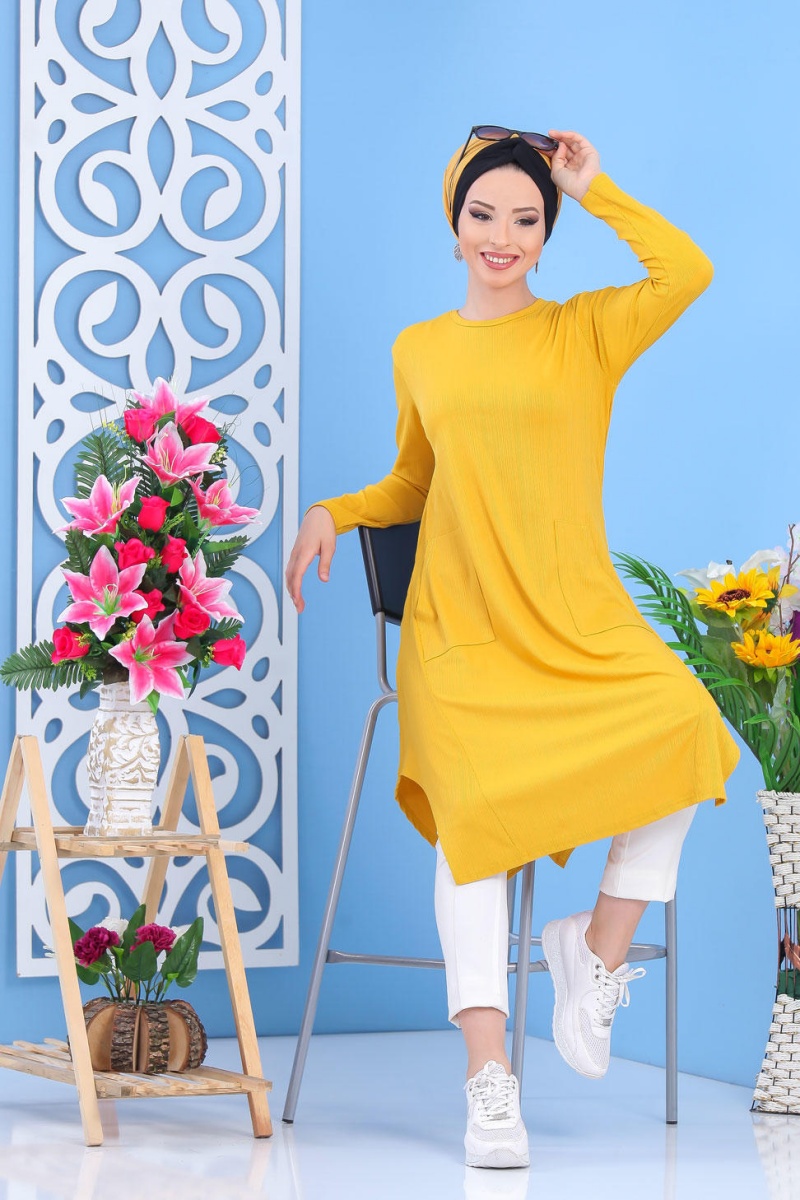 Tunique ample évasée boutonnée pour femme (Vetement Mastour pour Hijab) - Couleur Jaune moutarde - REF. 32238 (22.00 €) - En Promotion à 18.00 €