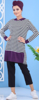 Tunique décontractée à capuche pour femme - Couleur blanche et violette à rayures noires - REF. 30420 (19.00 €) - En Promotion à 16.90 €