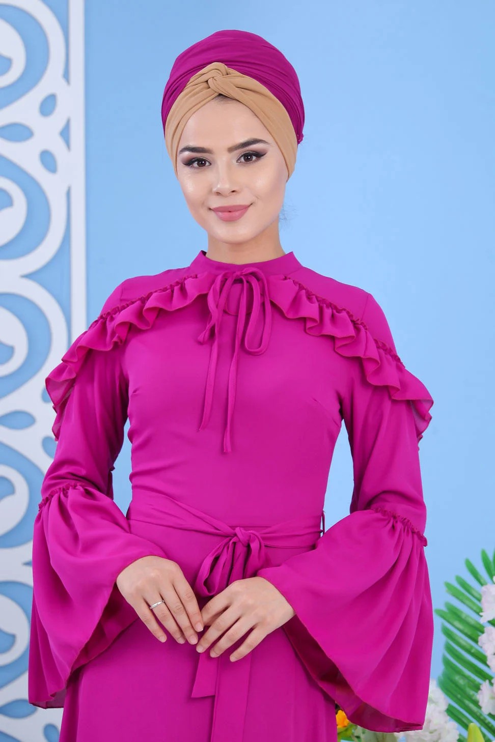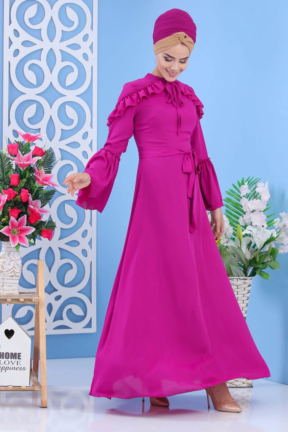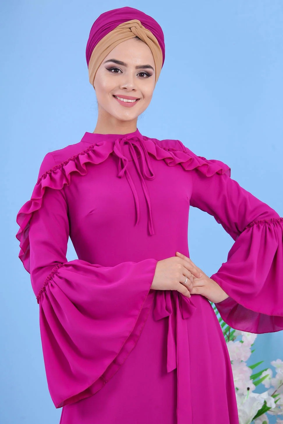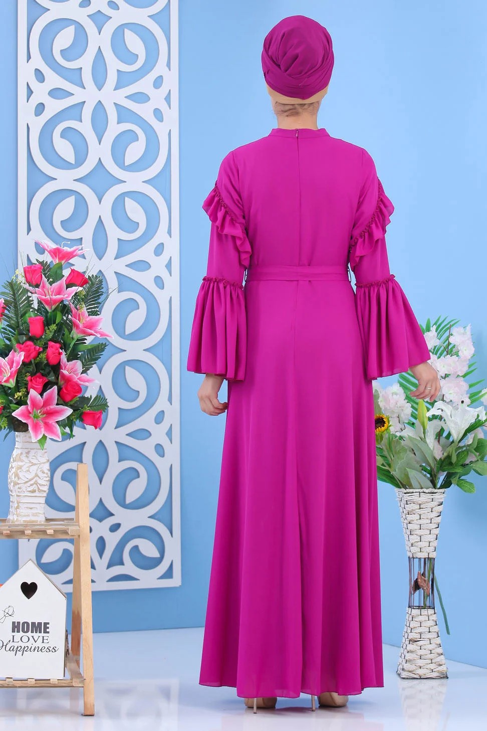 Robe bohème évasée entièrement doublée, col montant, manches longues à froufrou, une jolie ceinture fine nouer à la taille.