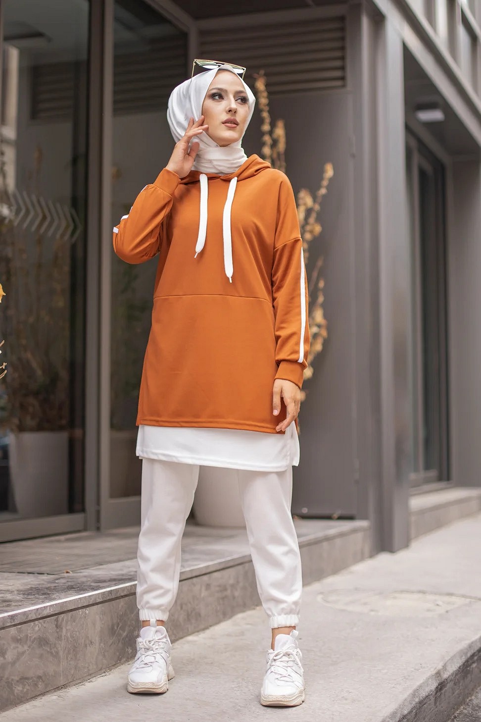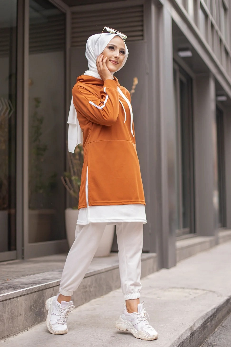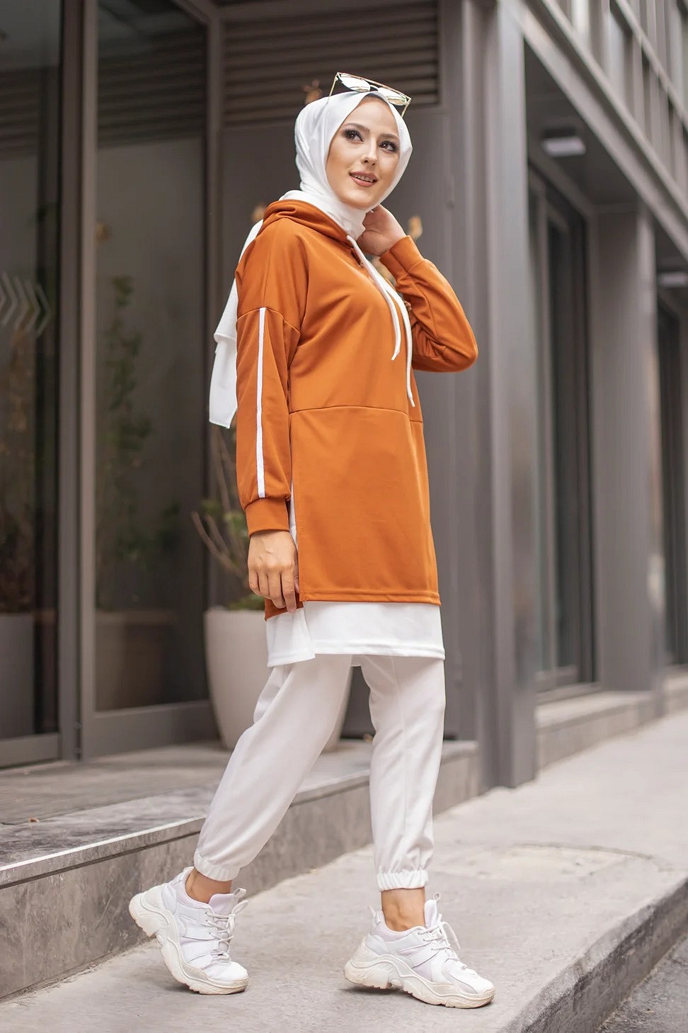 Tunique type sportswear, manches longues, col capuche à cordons de serrage contrastés. Extension de couleur blanche en bas de la tunique