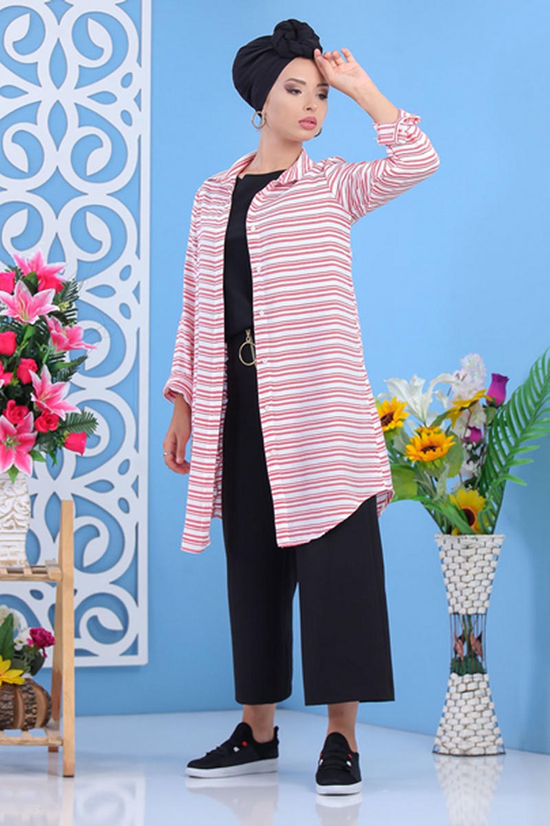 Tunique longue à rayures avec capuche (Vêtement décontracté et sport pour hijab) - Couleur brique - REF. 35740 (19.00 €)