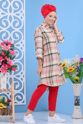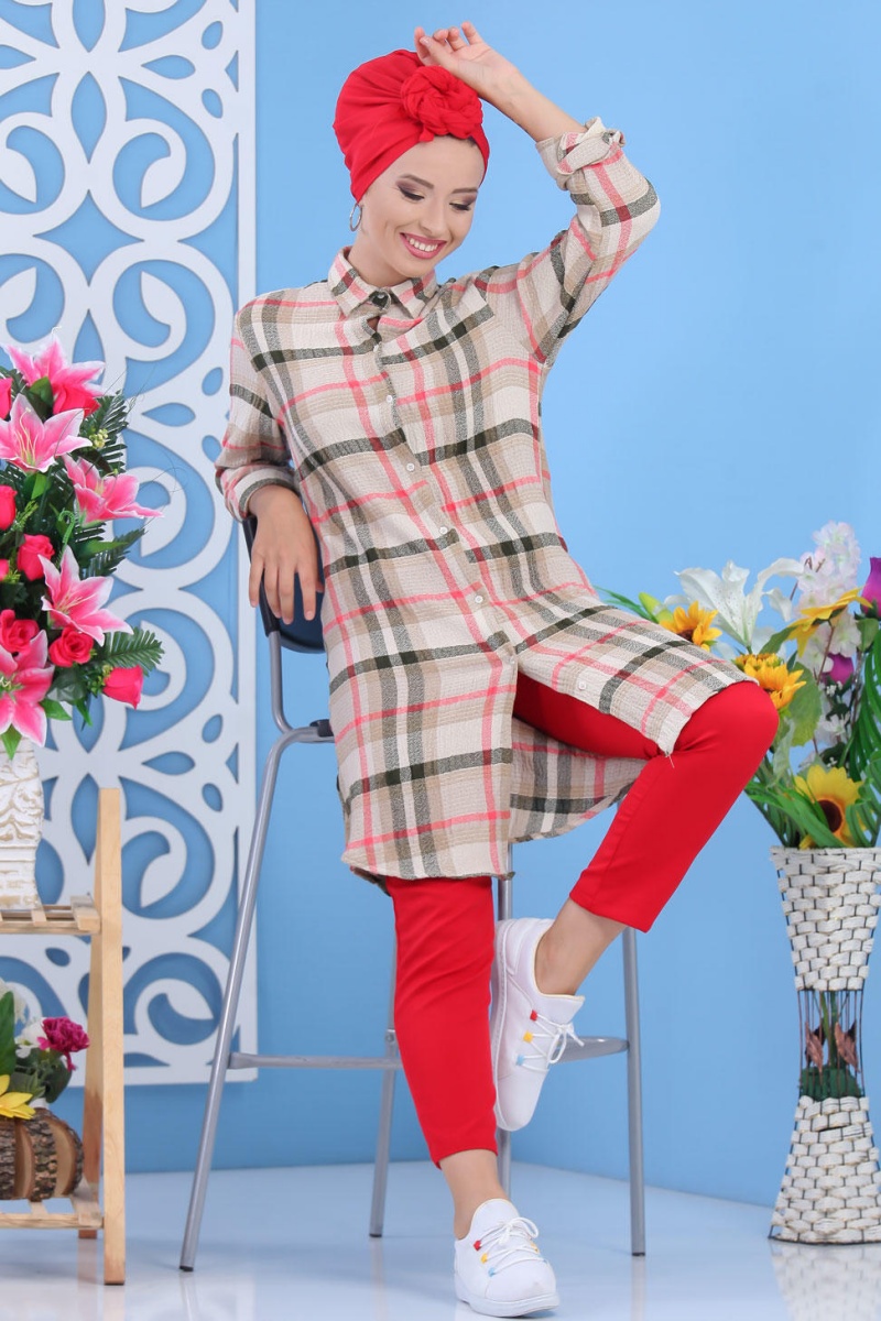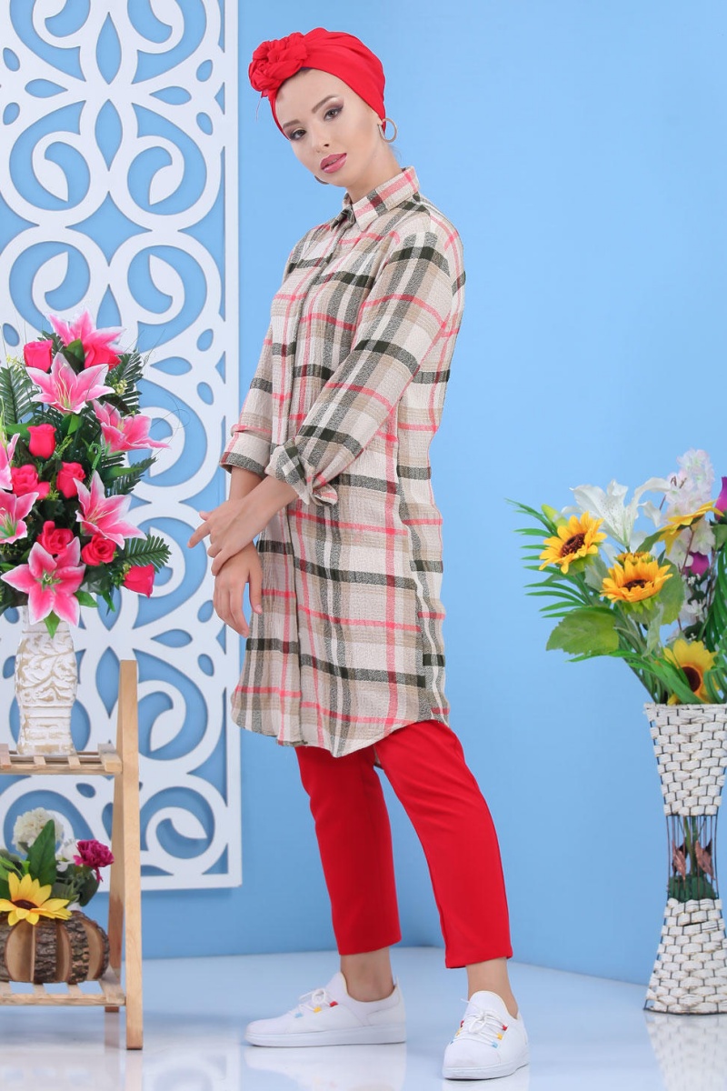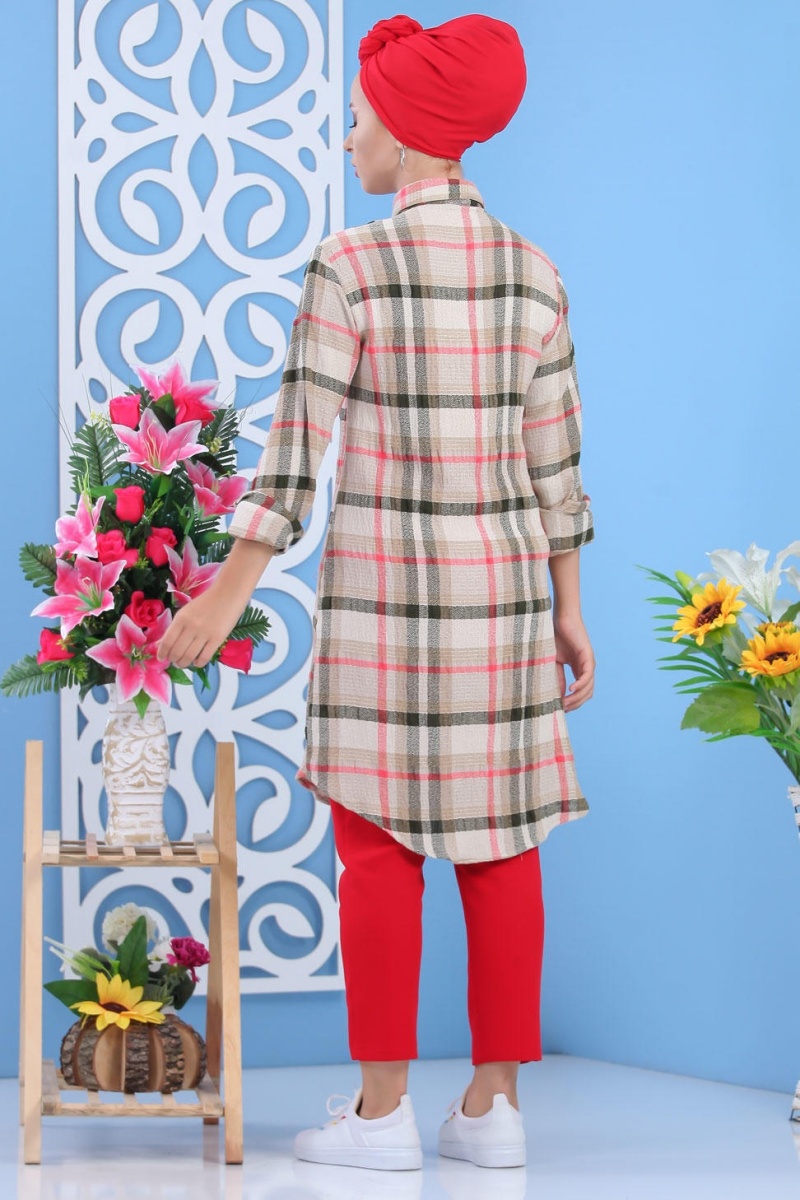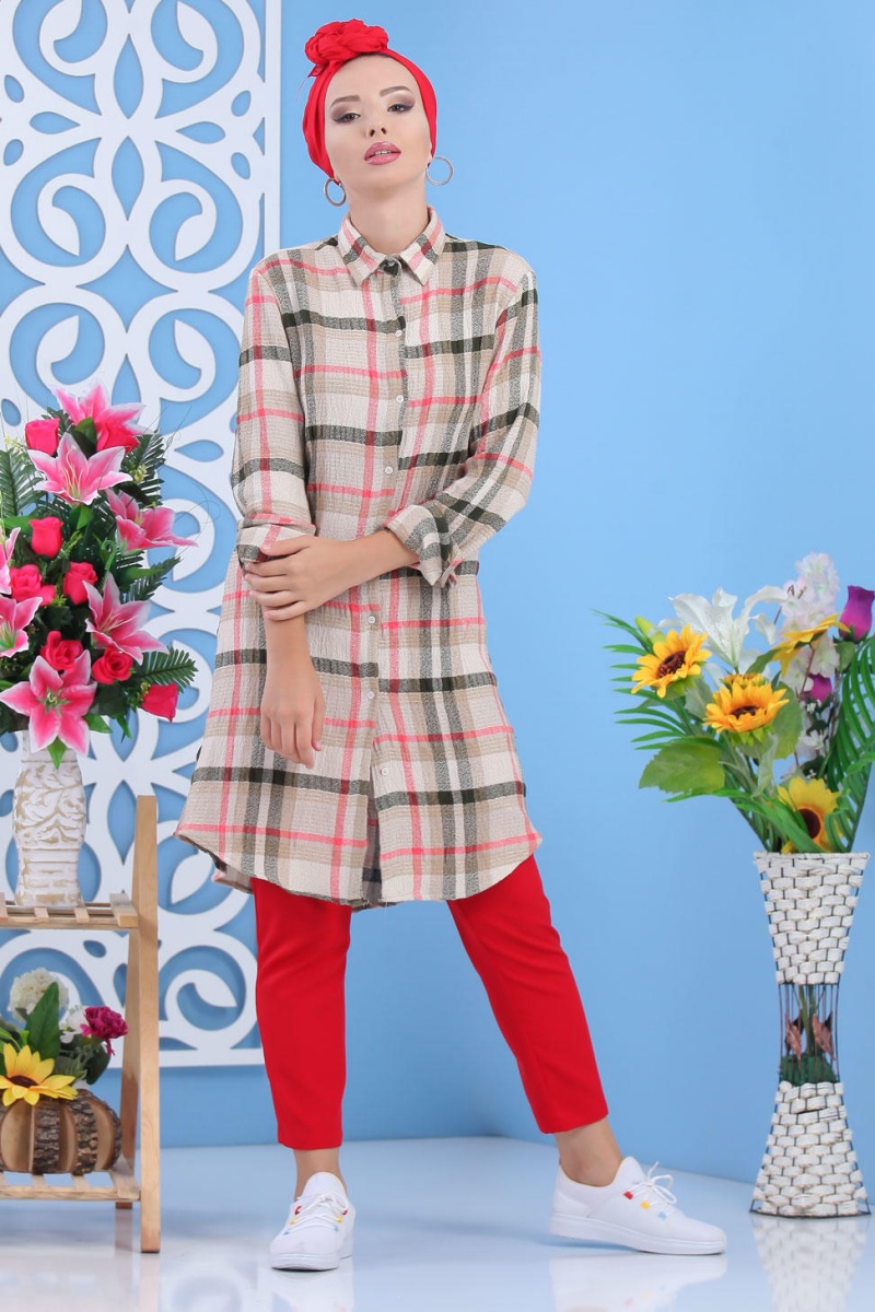Chemise longue à carreaux de couleur beige, kaki et rouge Vetement & Accessoire