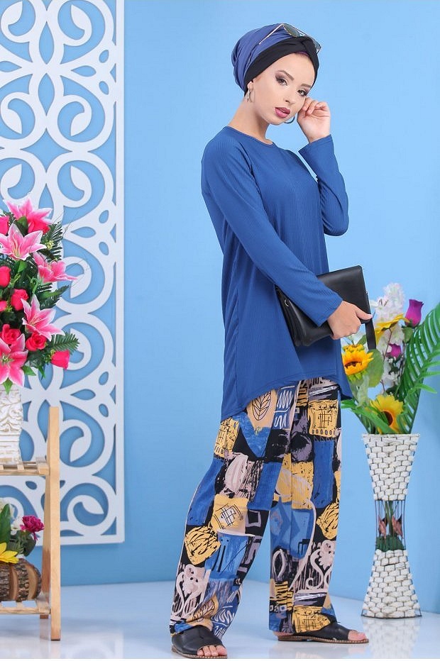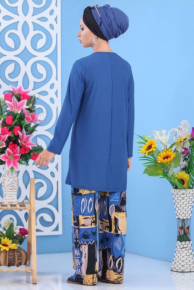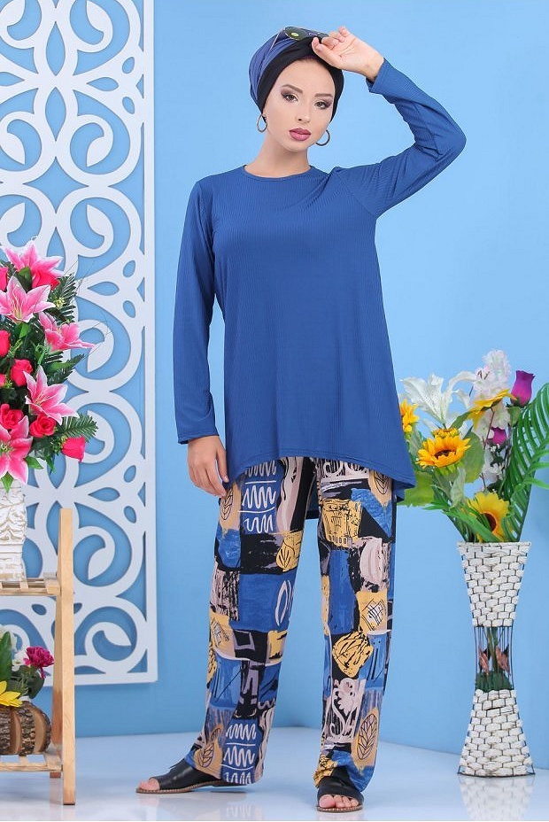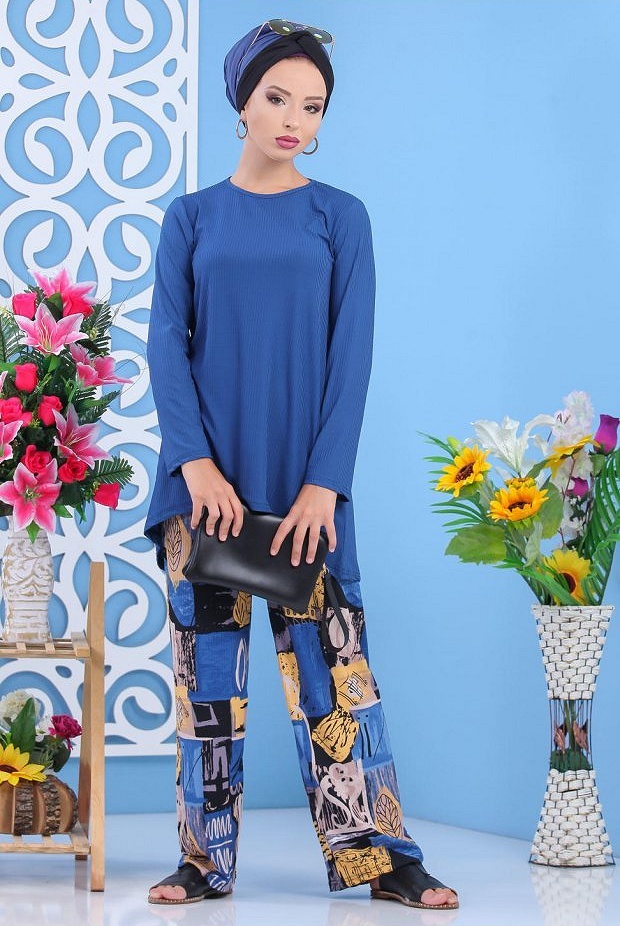 Ensemble deux pièces; tunique mi longue, col rond, coupe légèrement évasée ; pantalon ample, taille élastique. Tissu effet strié.