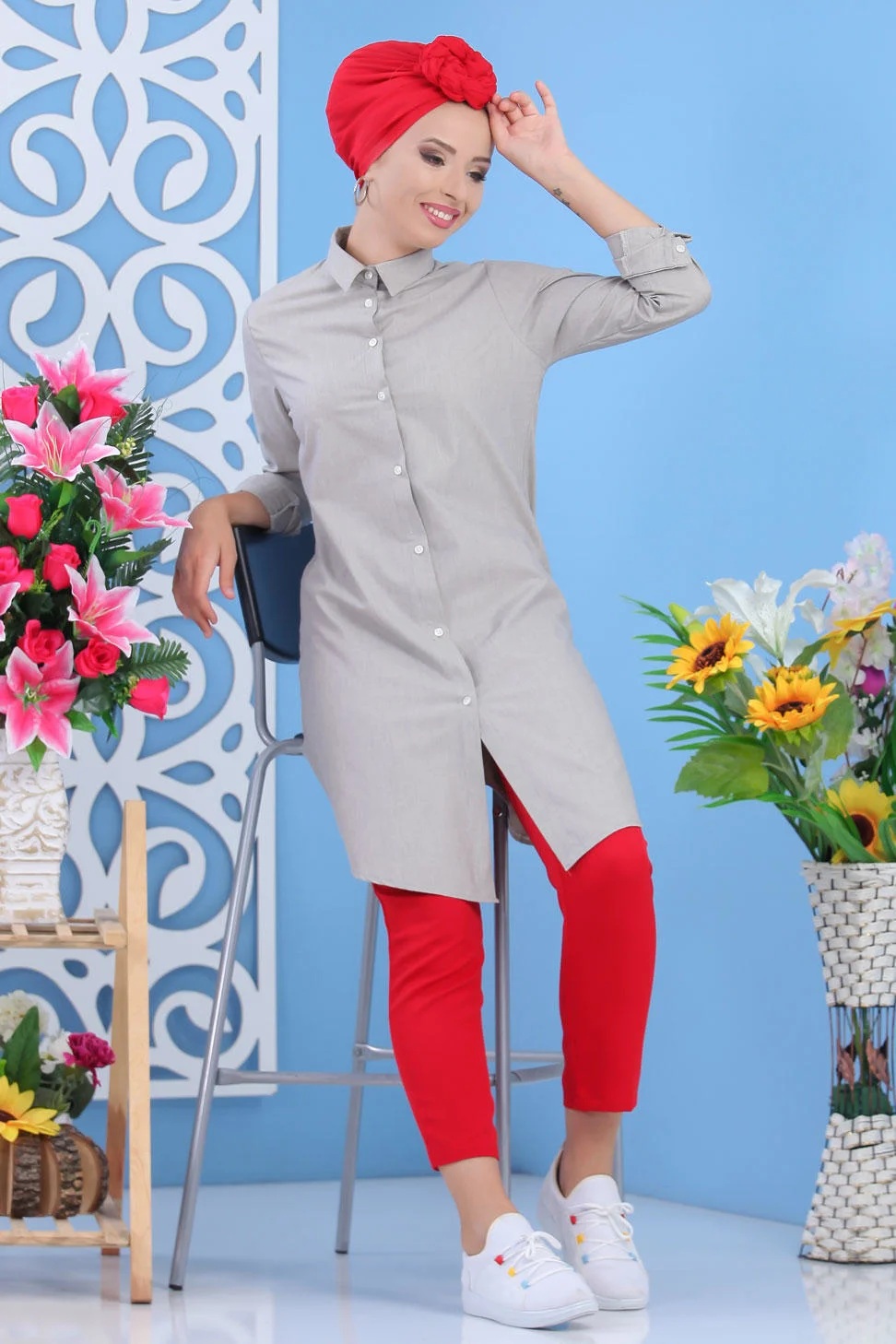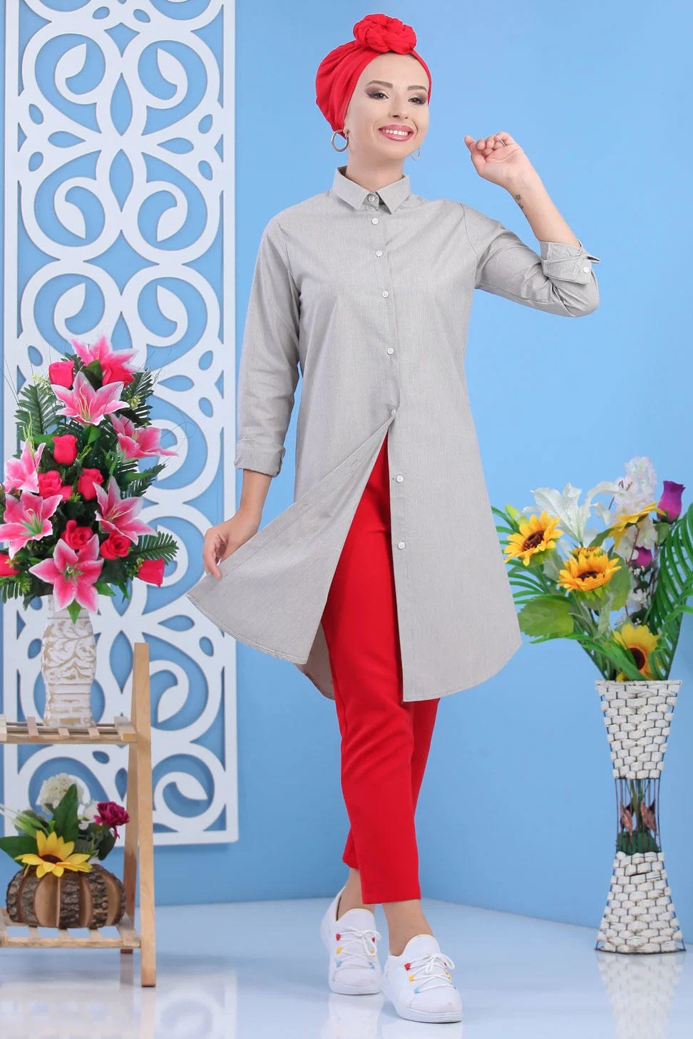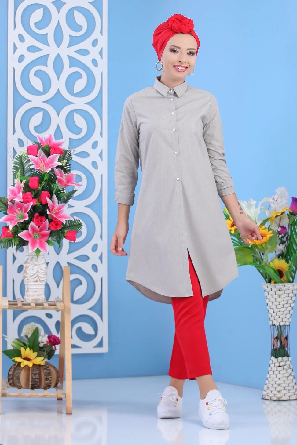 Chemise longue boutonnée type tunique (Vetements et tenues pour Hijab) - Couleur Beige - REF. 34697 (25.00 €)