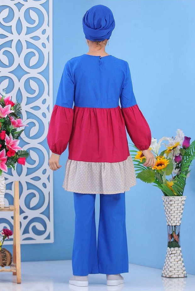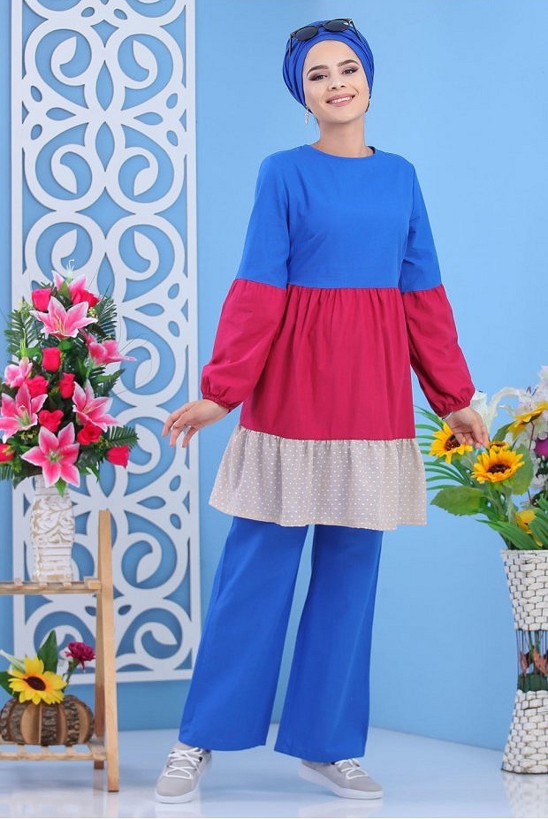 Ensemble 2 pièces : Tunique longue, col rond fermeture bouton, manches légèrement bouffantes, volants, coupe évasée ; et son pantalon assorti ample, coupe droite, taille élastique. Mélange de matières. Cet ensemble sobre et élégant n'a besoin de rien d'autre pour être mis en valeur.