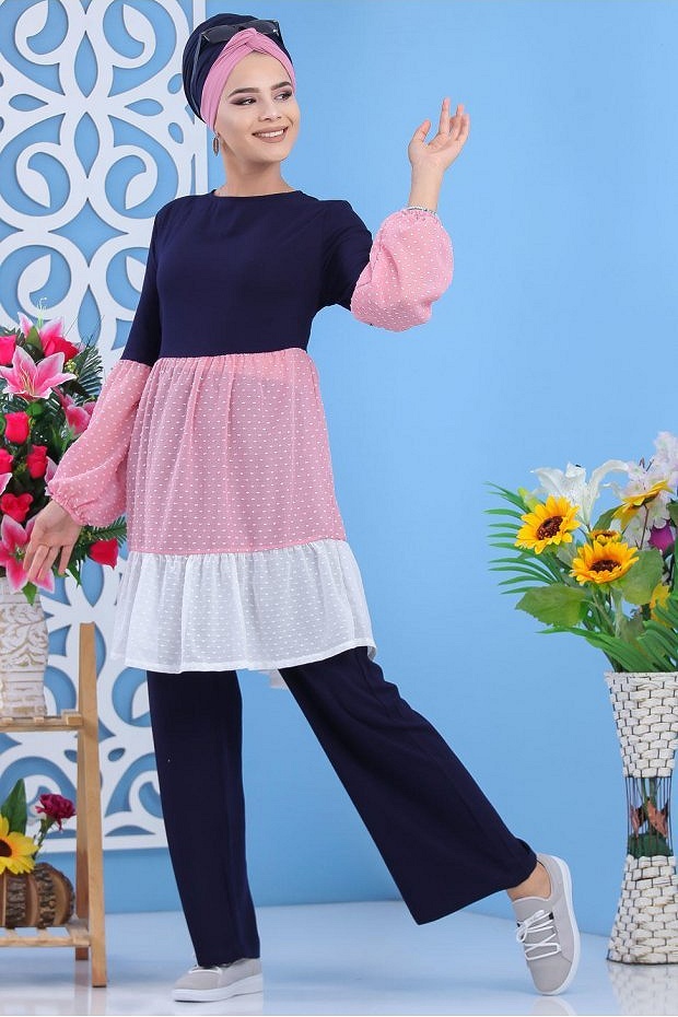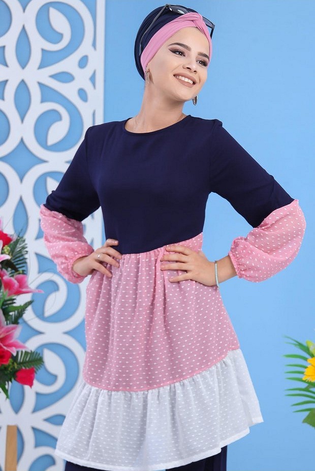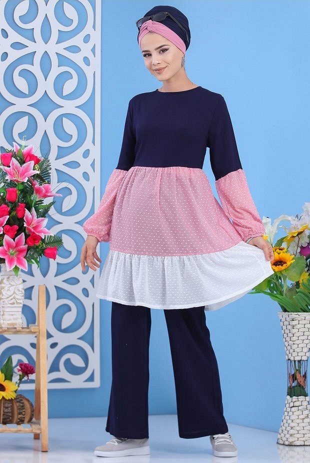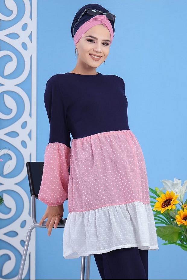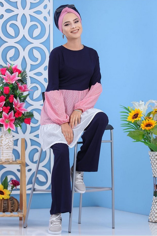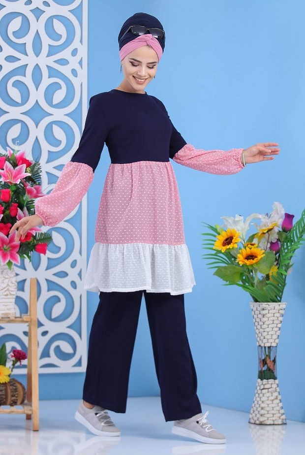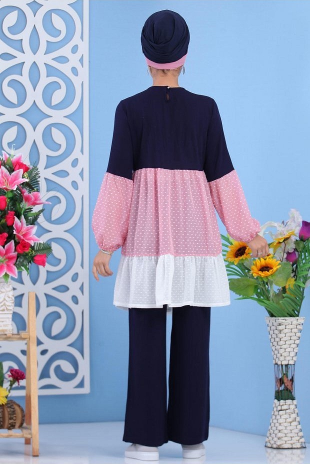 Ensemble femme 2 pièces (tunique et pantalon) de couleur bleu marine, rose et blanc Vetement & Accessoire