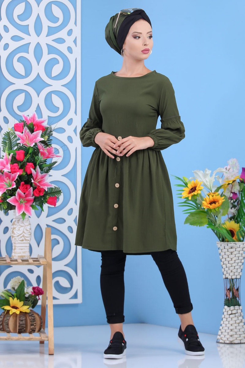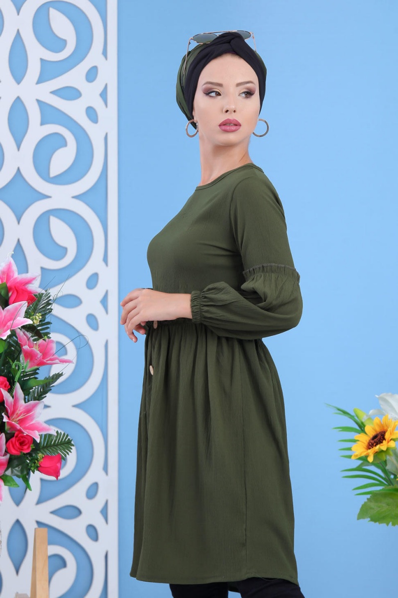 Tunique longue, col rond, manches bouffantes finition élastiques au niveau des poignets, taille cintrée et élastique, tissu effet crêpe. Ce modèle simple et classique vous conviendra car il s'assemble avec tout type de vêtements, les boutons d'ornement ajouteront un plus.