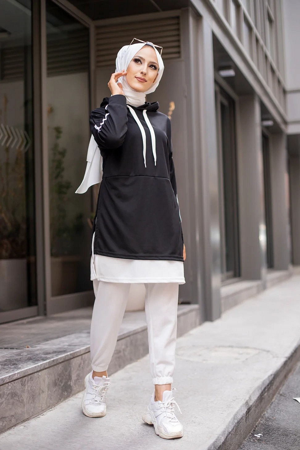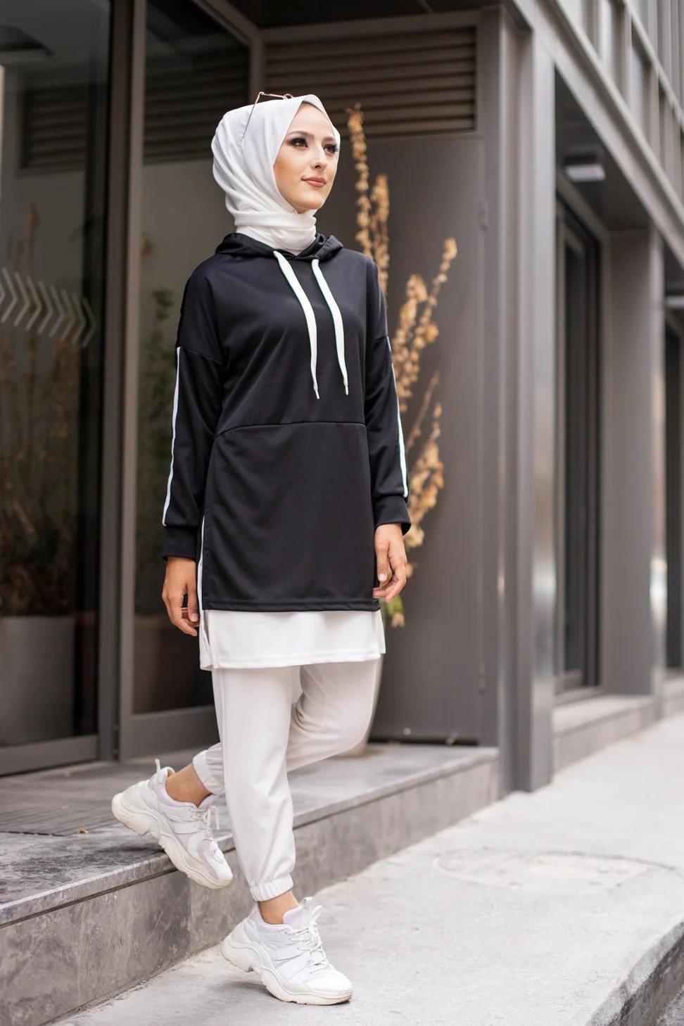 Tunique type sportswear, manches longues, col capuche à cordons de serrage contrastés. Extension de couleur blanche en bas de la tunique