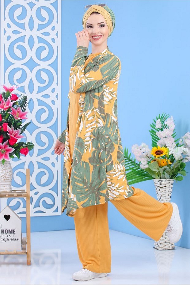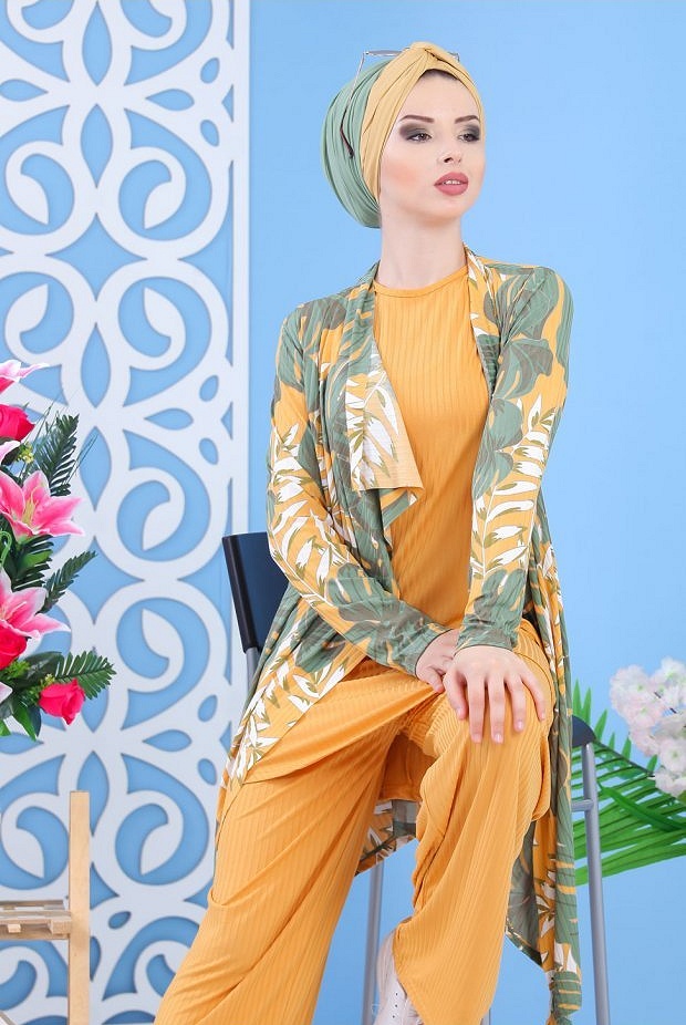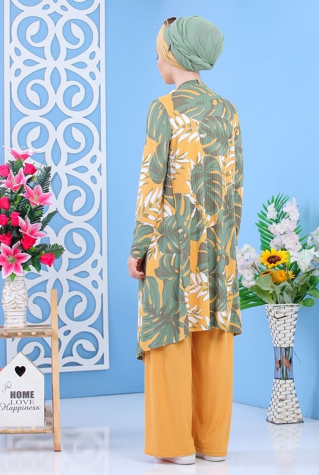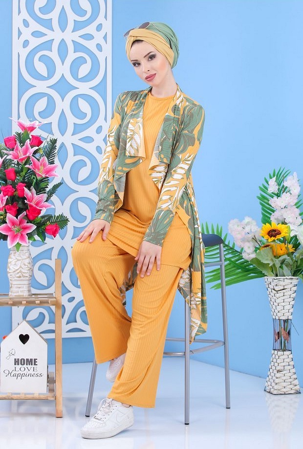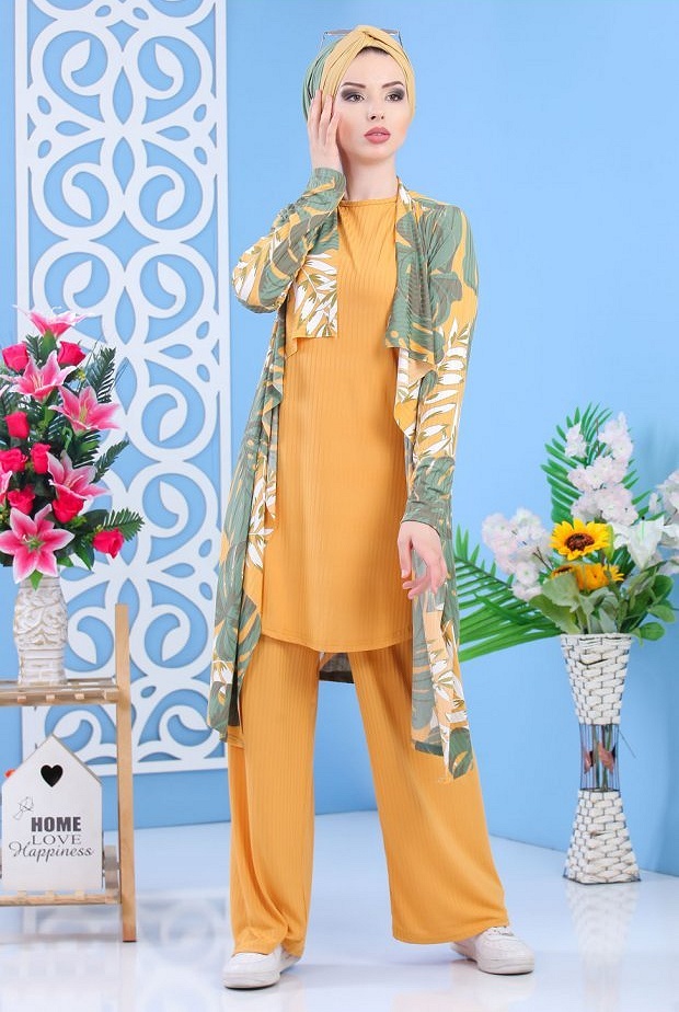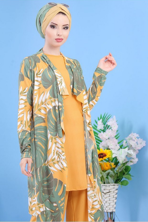 Ensemble trois pièces se composant d'un haut sans manches, col rond, d'un gilet long imprimé col châle, fluide et élégant, et d'un pantalon, taille élastique. Cet ensemble tendance vous permettra d'avoir un look parfait.