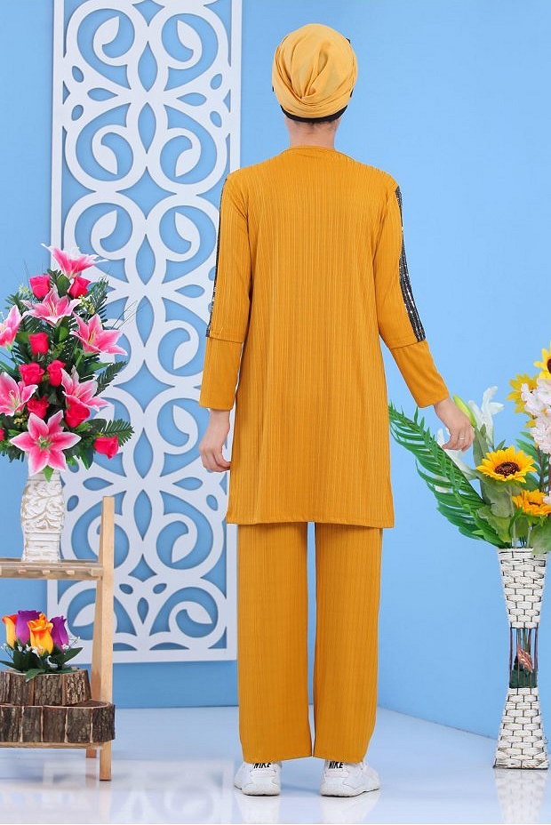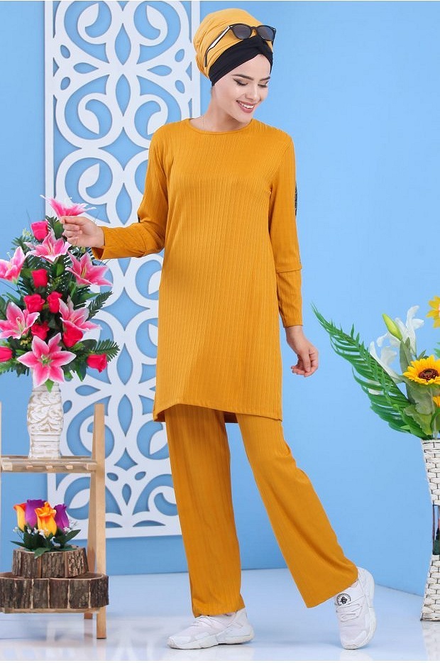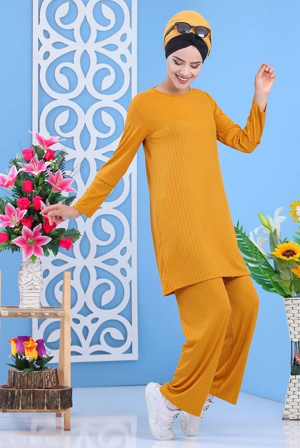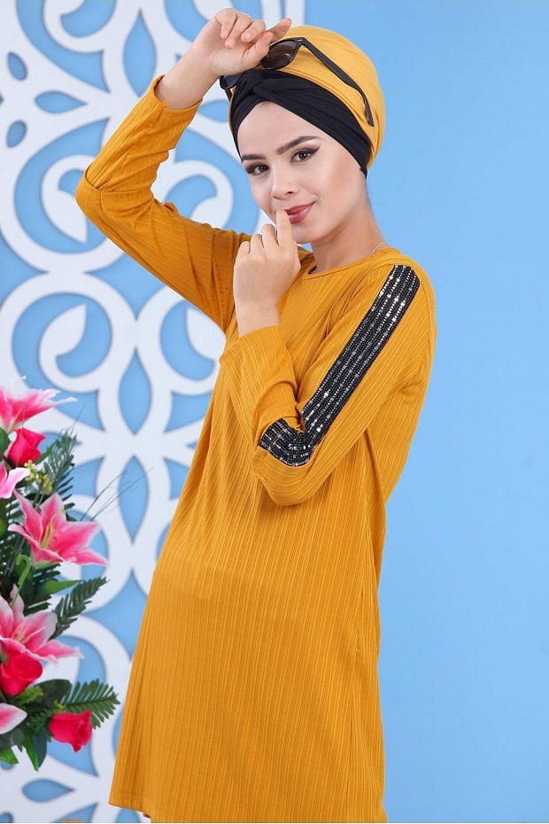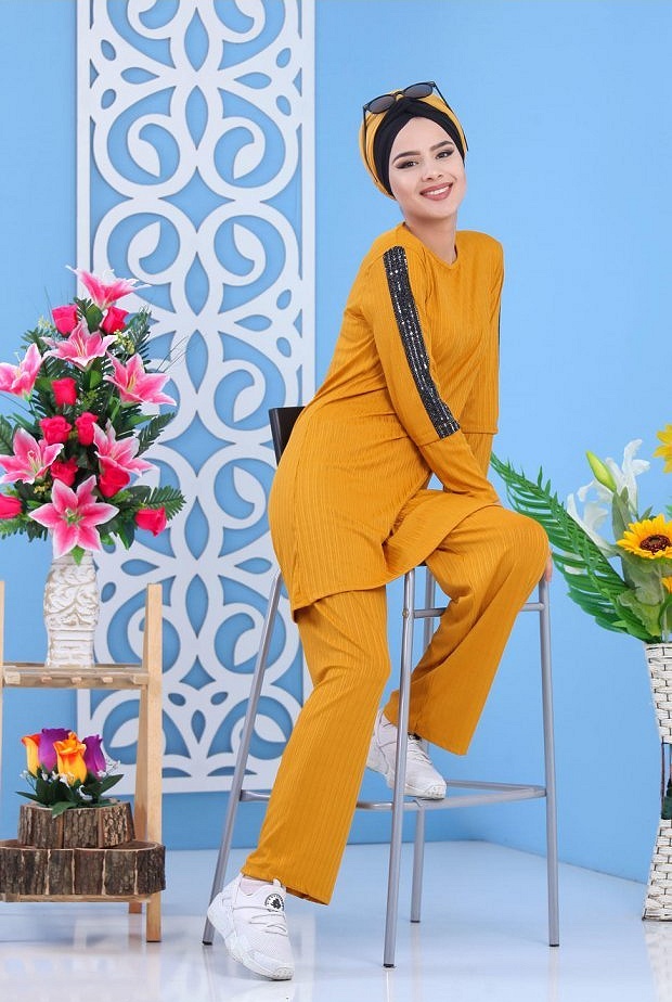 Ensemble 2 pièces, tunique col rond, coupe droite mi longue, manches décorées de strass sur toute la longueur. Pantalon coupe ample, taille élastique. Joli ensemble simple et chic avec son tissu effet strié. Adapté pour les 4 saisons.