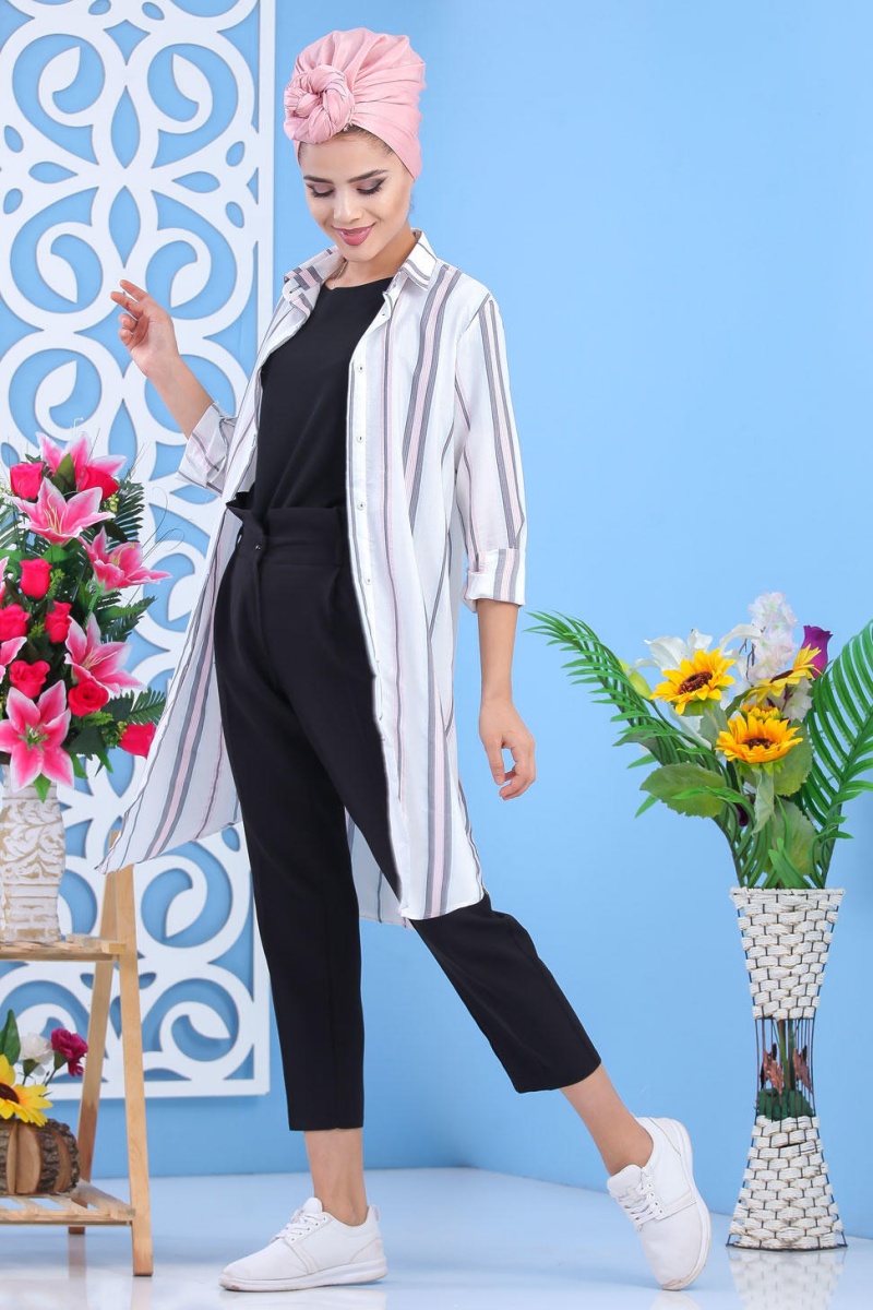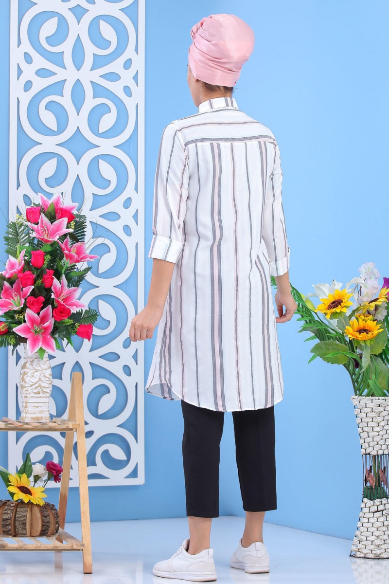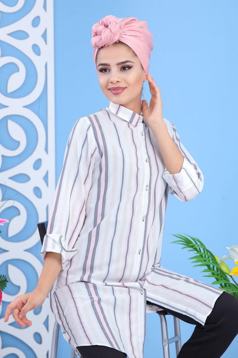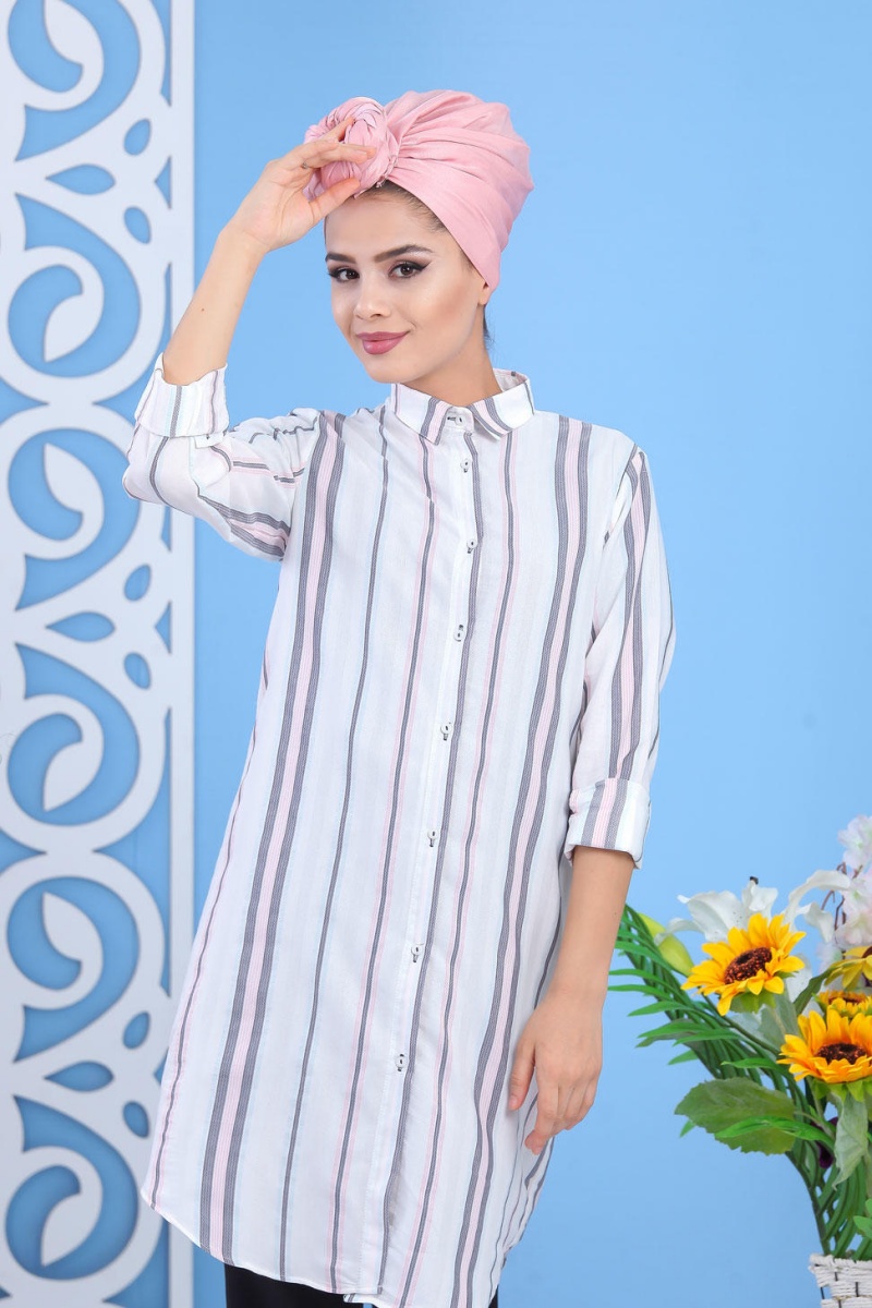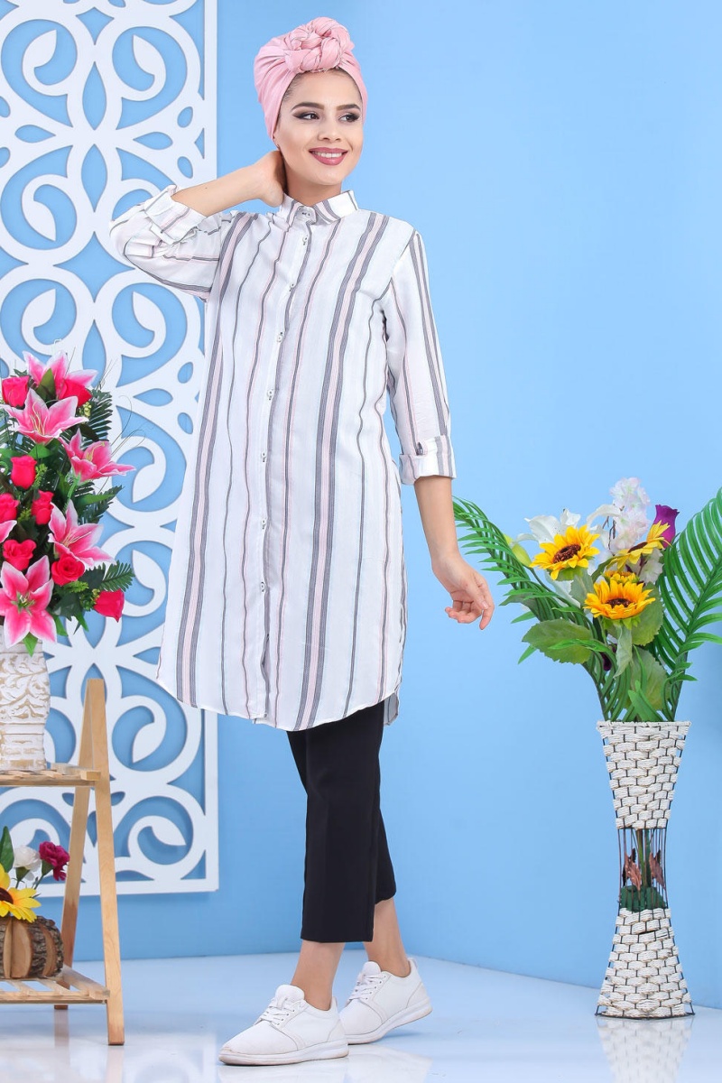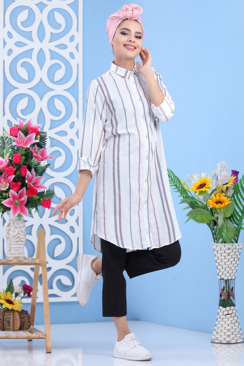 Chemise longue blanche à rayures (Chemises femmes) - Couleur Grise et Rose Vetement & Accessoire