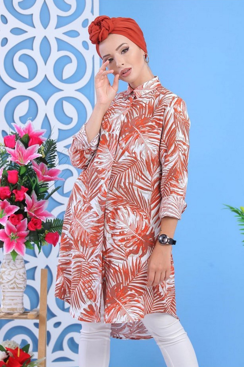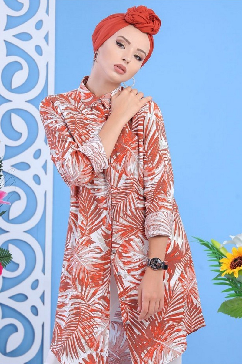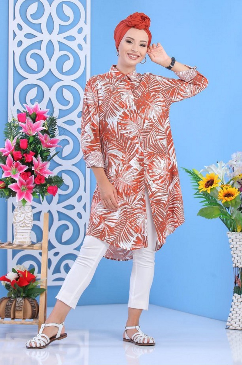 Chemise longue, col chemise, manches finition boutons aux poignets, coupe légèrement évasée, extrémités arrondies. Ce modèle imprimé au design tropical, très tendance, vous permettra de sortir du commun. Vous pourrez le porter aussi bien en journée qu'en soirée.