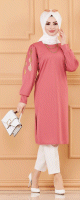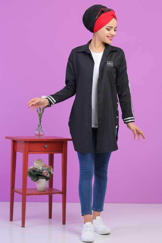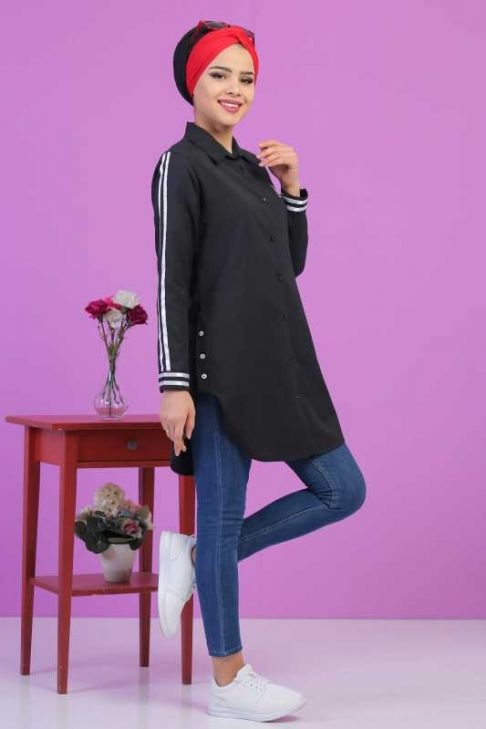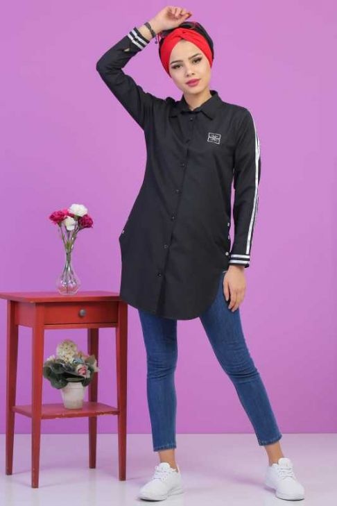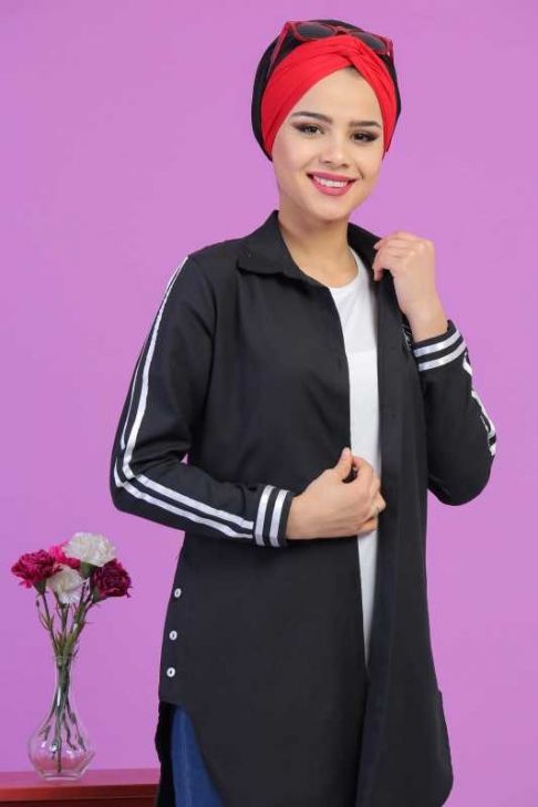 Chemise mi-longue, col chemise, bandes satinées blanches sur les manches ainsi que sur les poignets, boutons fantaisie sur les cotés. Ce modèle classique et chic restera toujours dans la tendance, vous pouvez donc l'acheter sans hésiter.
