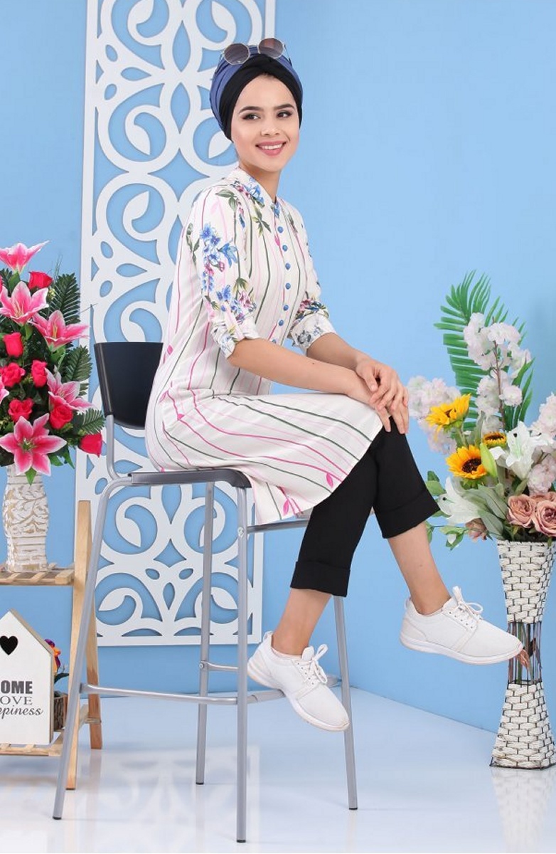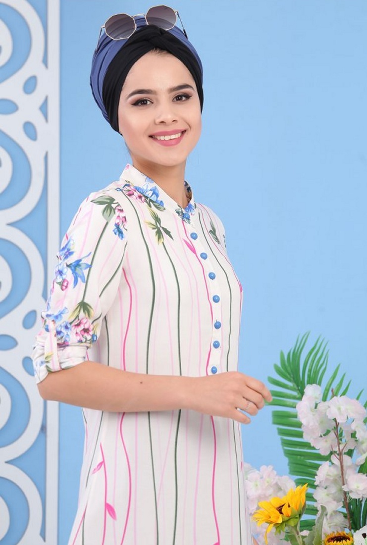 Tunique longue, col Mao fermeture boutons, manches longues retroussables grâce à des pattes boutonnées, coupe droite. Ce modèle au tissu léger aux motifs originaux pourra s'associer avec beaucoup de vos vêtements.