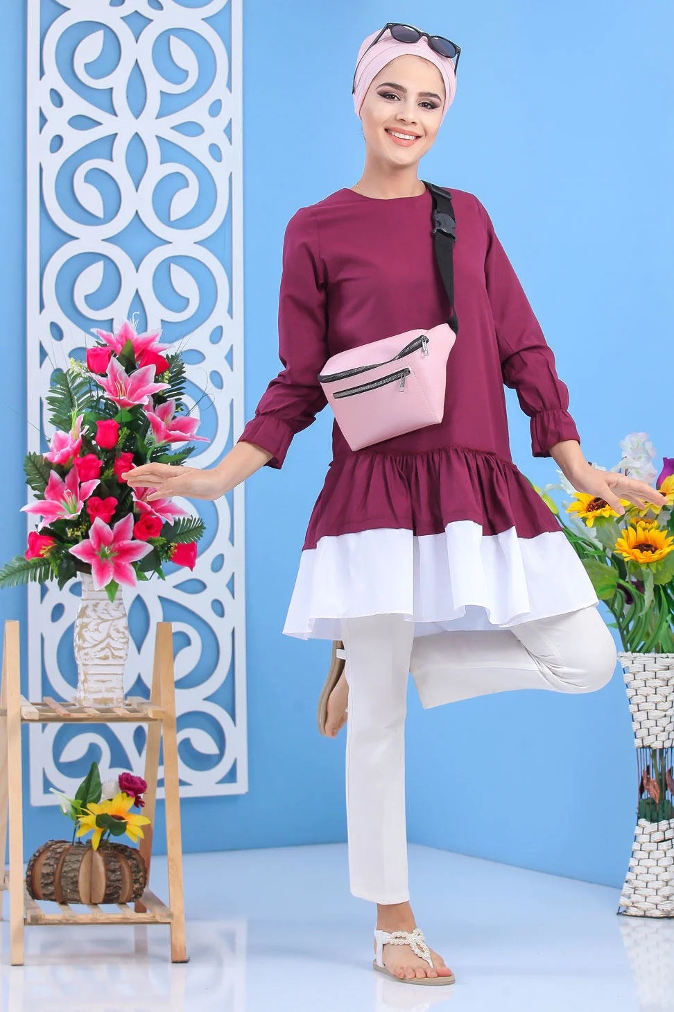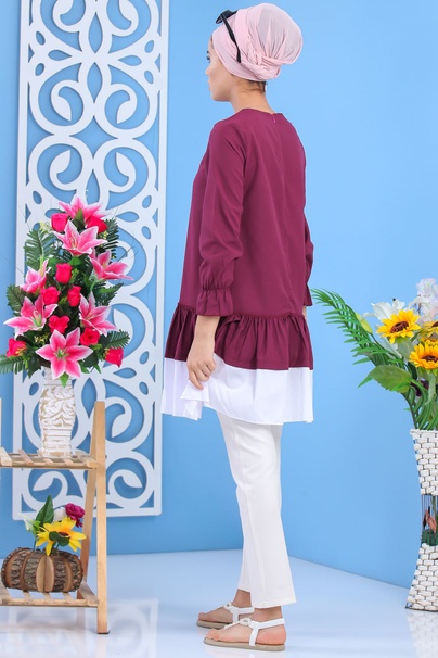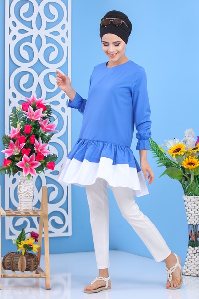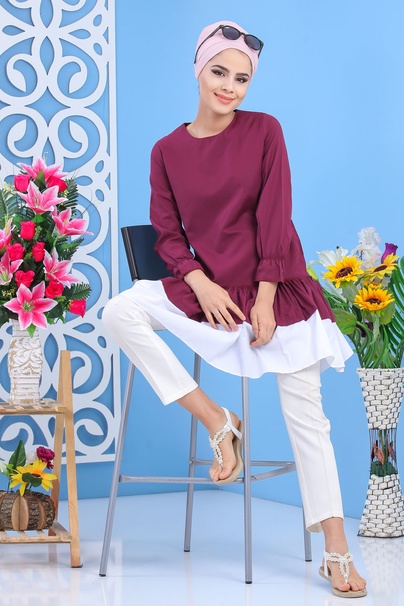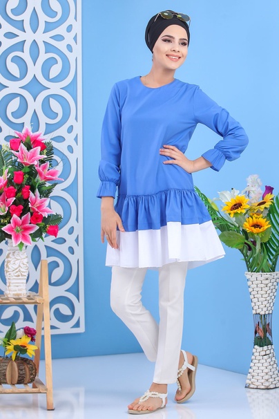 Tunique longue, col rond, fermeture zippé au dos, manches finition froufrous aux poignets, tissu léger. Cette tunique avec sa coupe originale et son volant dépareillé vous permettra de l'associer avec ce que vous voulez.