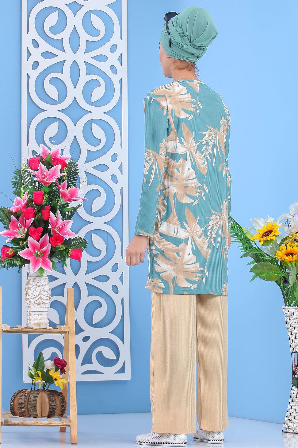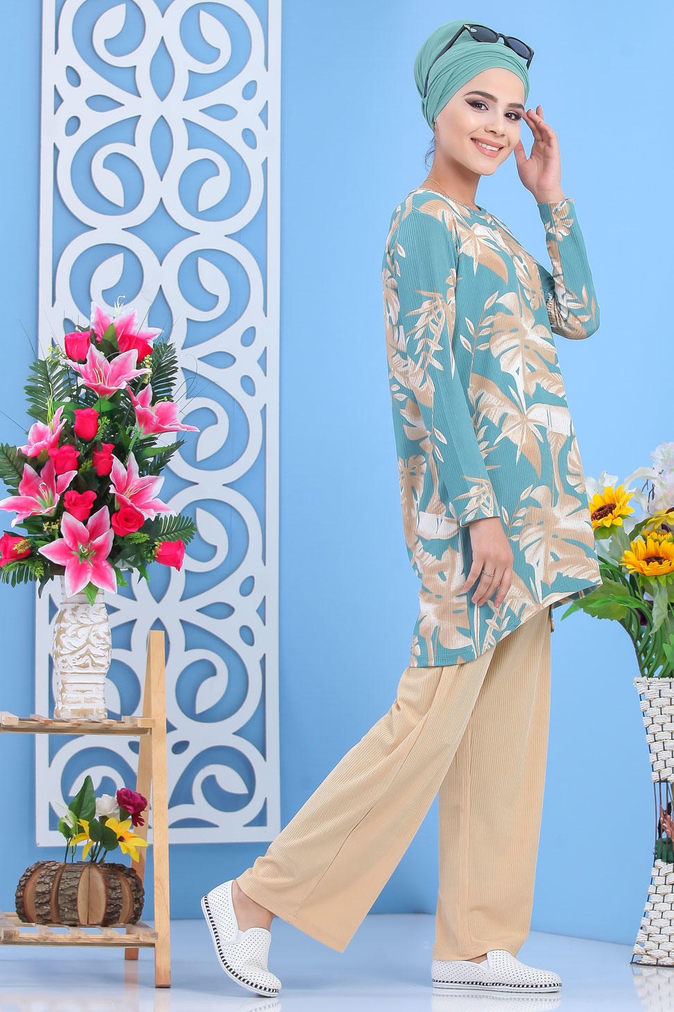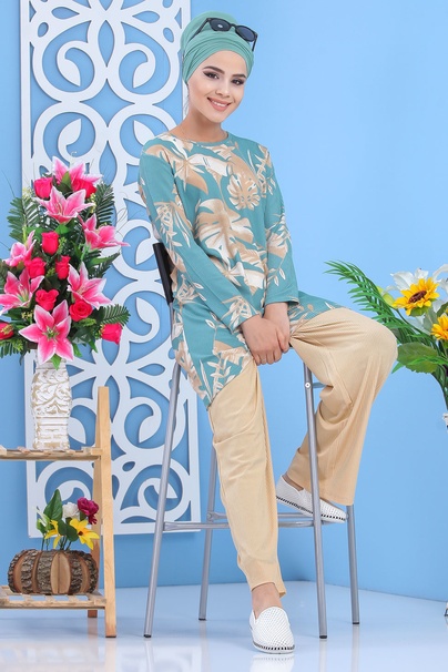 Tenue décontractée 2 pièces Tunique et Pantalon pour femme - Couleur Vert clair et Beige Vetement & Accessoire
