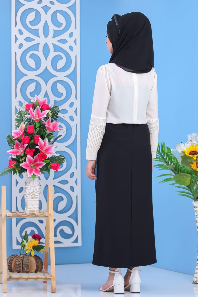 Ensemble 2 pièces chic pour femme (Tenue Modest Fashion) - Haut et jupe noir et gris à carreaux - REF. 32201 (29.00 €)