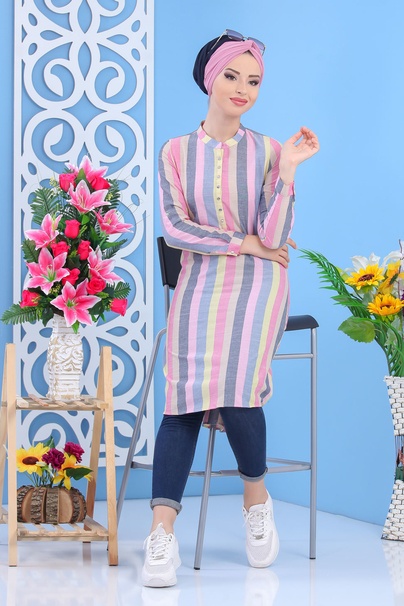 Tunique à rayures à pressions de couleur jaune, rose, beige et gris (100% coton) Vetement & Accessoire