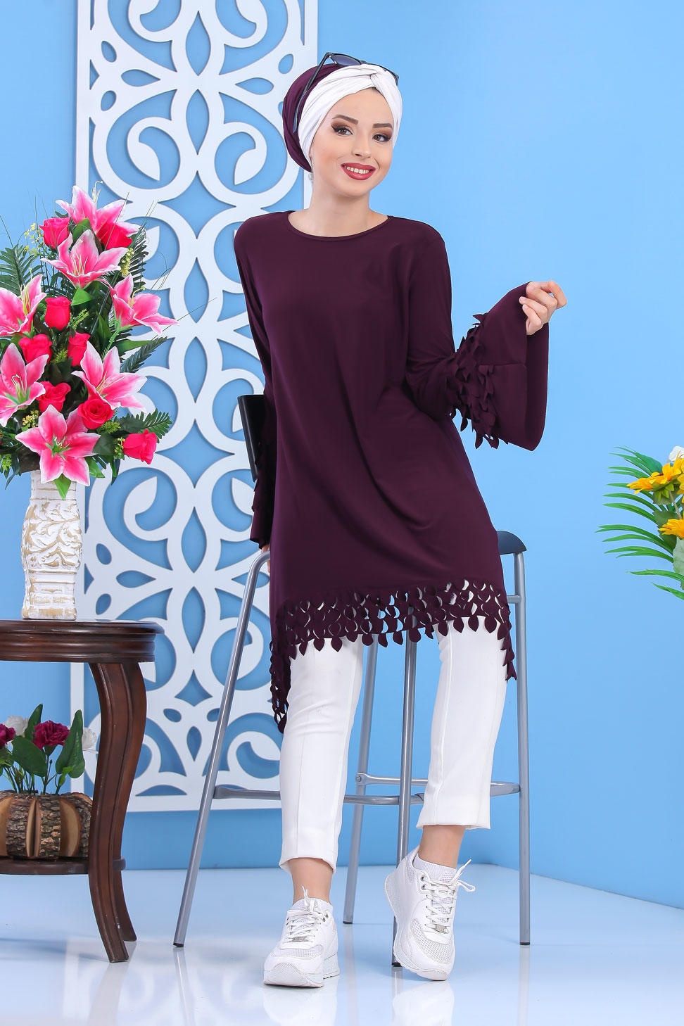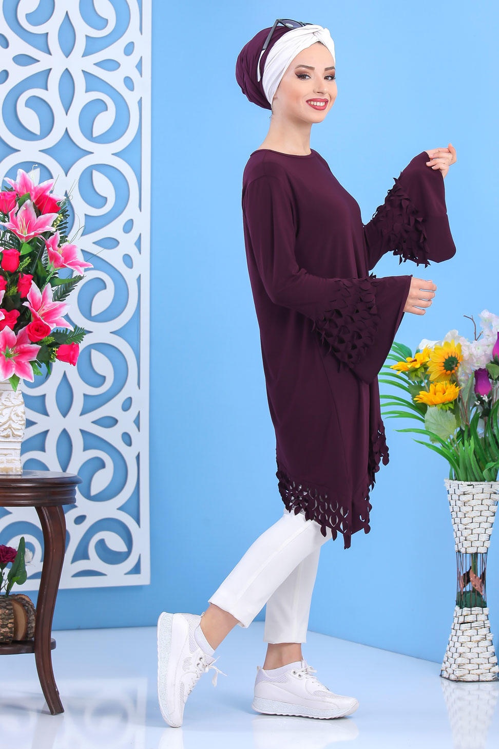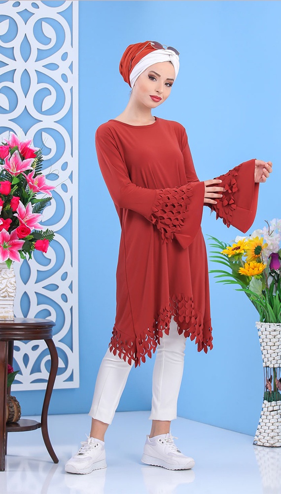 Tunique longue, col rond, manches évasées, coupe ample. Avec son effet plume sur les manches et le bas cette tunique vous plaira pour son originalité.