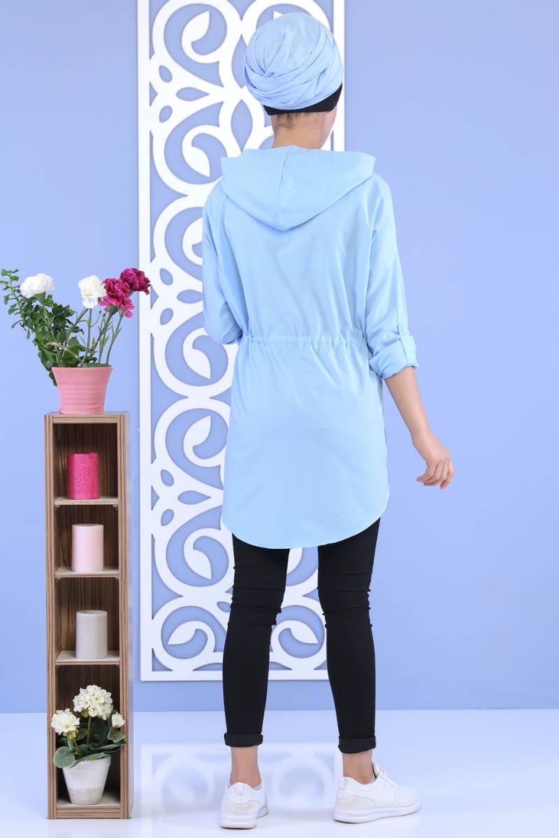 Tunique longue, col ouvert, capuche, manches retroussables finitions boutons aux poignets, grande poche sur le devant, taille avec lien de serrage. Cette tunique avec sa coupe originale peut se porter aussi bien cintrée que droite, à vous de faire le bon choix.