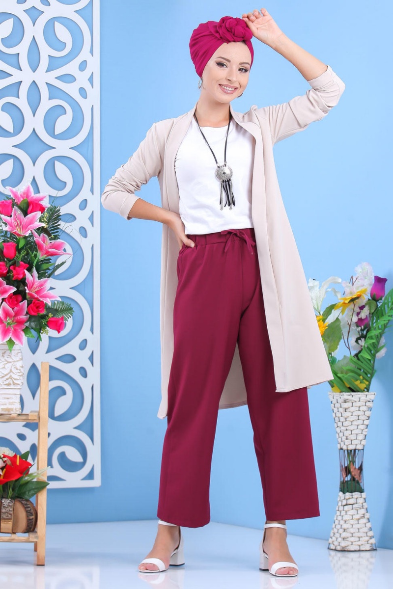 Ensemble casual : Palazzo ample et Blouse avec collier assorti pour femme (Ensembles Hijab Turque) - Couleur crème et Bordeaux - REF. 32867 (19.90 €)