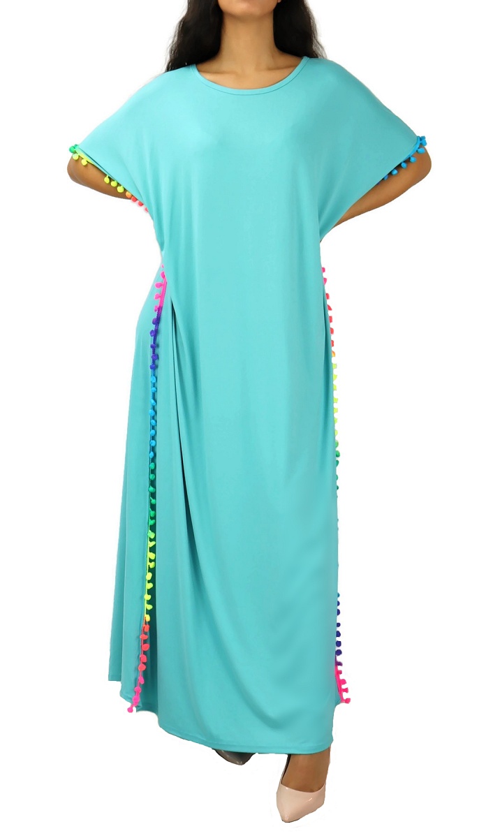 Robe orientale à pompons multicolores sur les côtés pour femme - Couleur bleu cyan Vetement & Accessoire