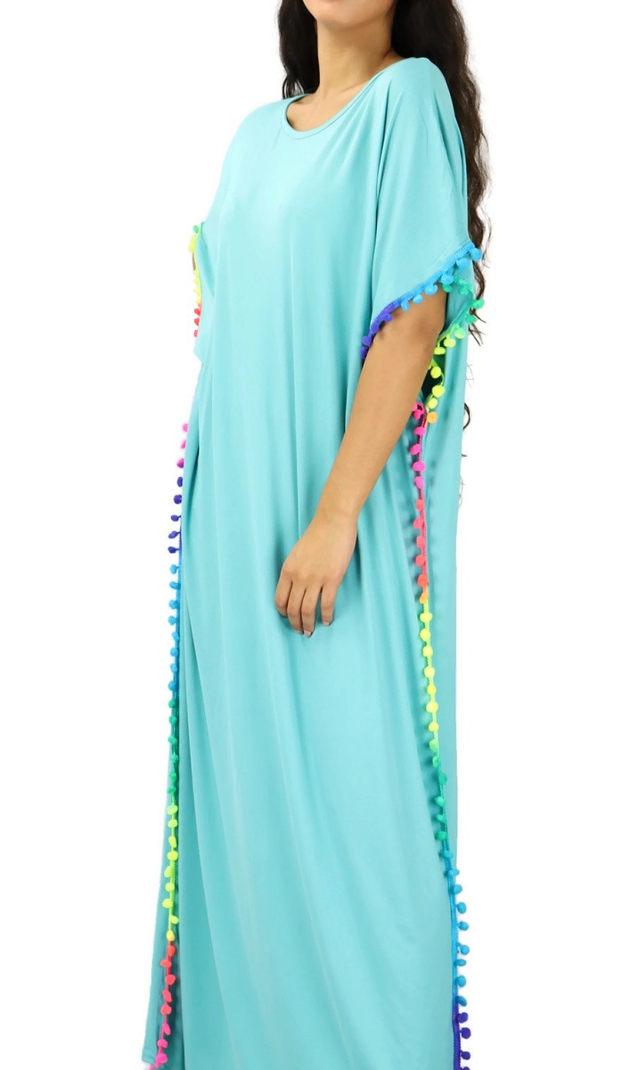 Robe orientale a pompons multicolores sur les cotes pour femme - Couleur bleu cyan