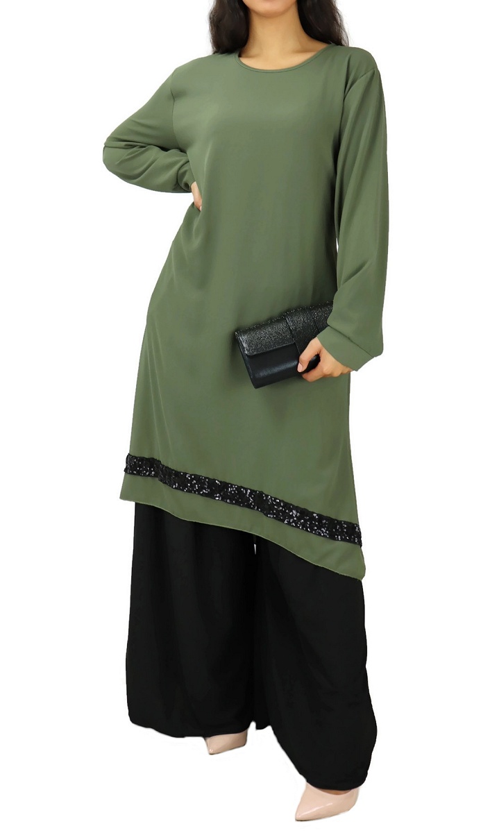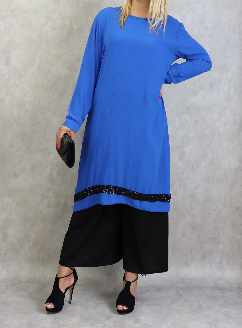 Belle tunique en crêpe léger avec une bande pailletée (strass noirs) sur le bas. Encolure arrondie. Manches longues. Peut se porter aussi bien au quotidien que pour des occasions.