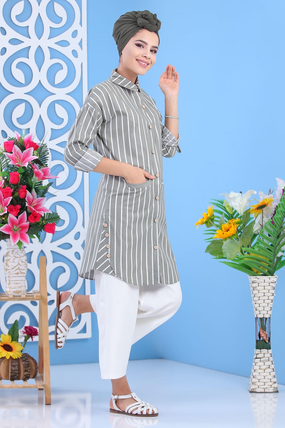 Chemise longue, col chemise, manches finition boutons aux poignets, coupe droite, décorations boutons sur les cotés, 2 poches mi-hauteur. Ce modèle reste un basique et indémodable qui se porte en toute saison et diverses occasions.