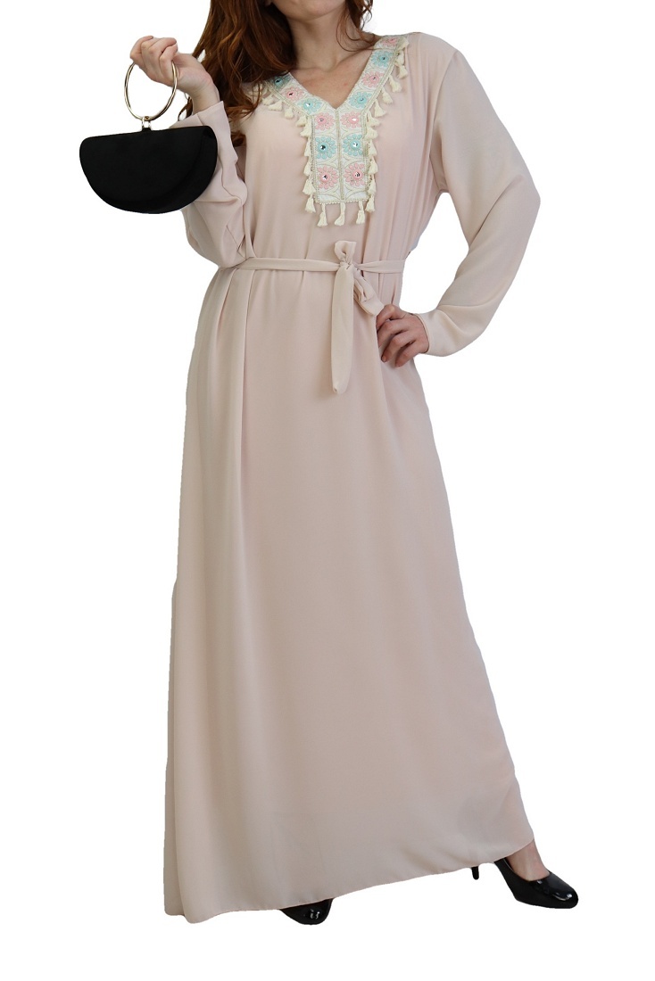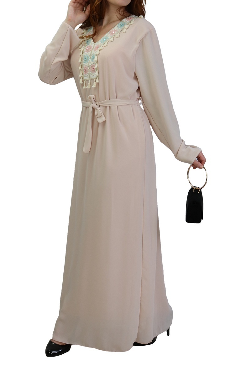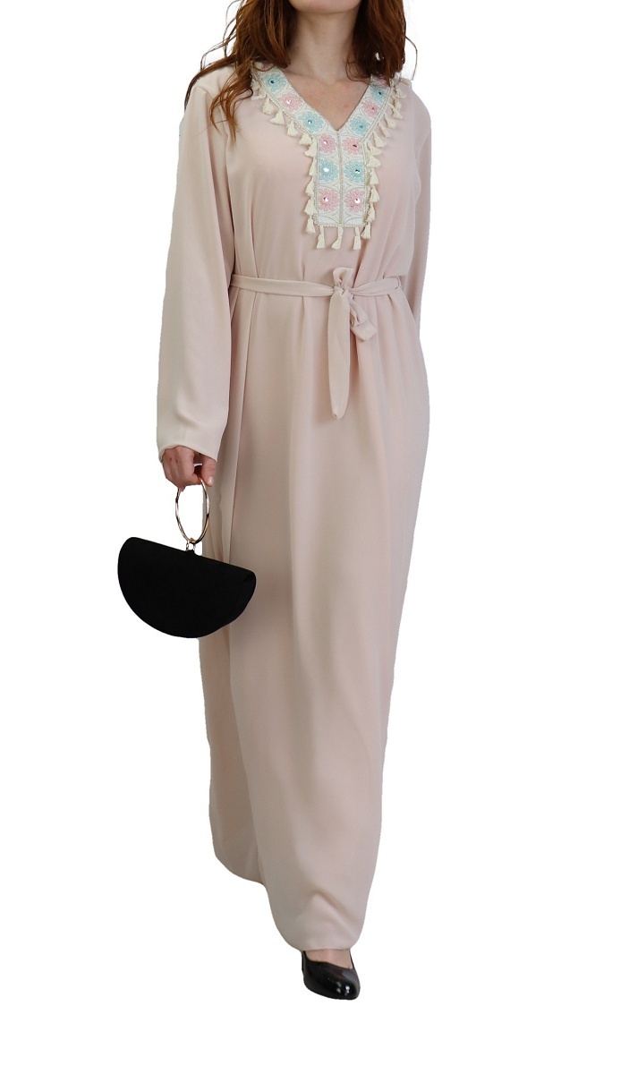 Robe longue fluide avec broderies blanches et dorées pour femme - Couleur Taupe - REF. 29630 (29.90 €)