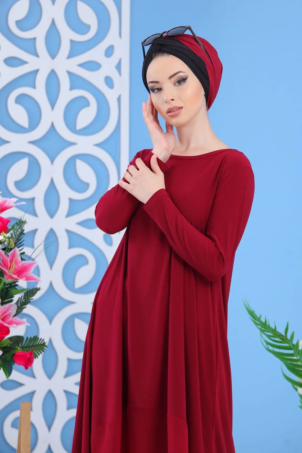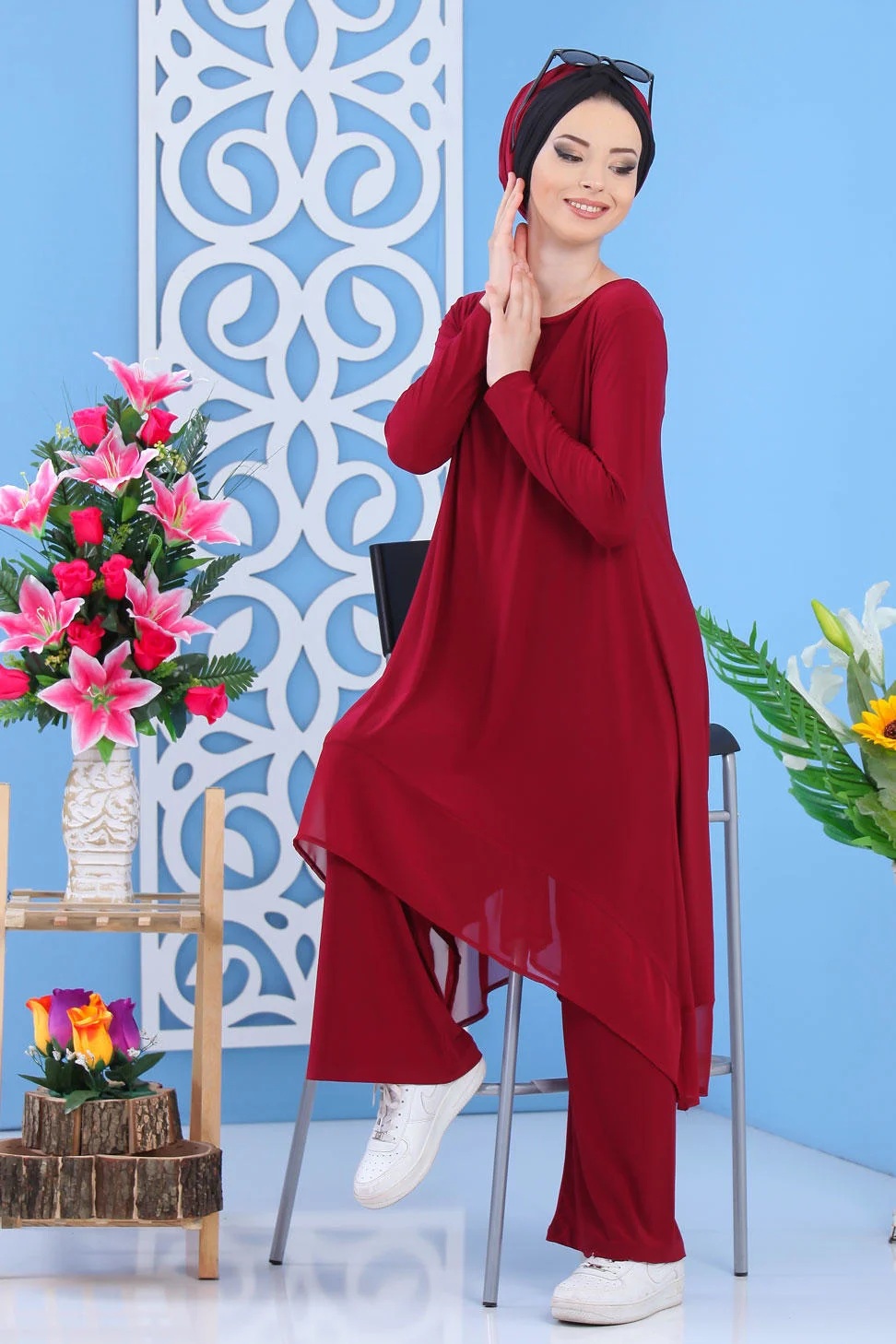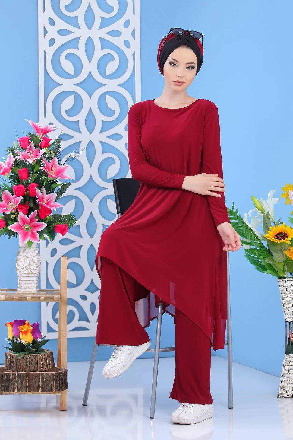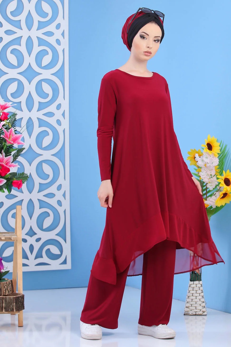 Ensemble 2 pièces, tunique mi longue, col rond, coupe évasée, manches longues. Pantalon coupe ample, taille élastique. Joli ensemble simple et chic avec son tissu léger et agréable. Ce modèle permet d’être porté en toute décontraction et en toute saison.