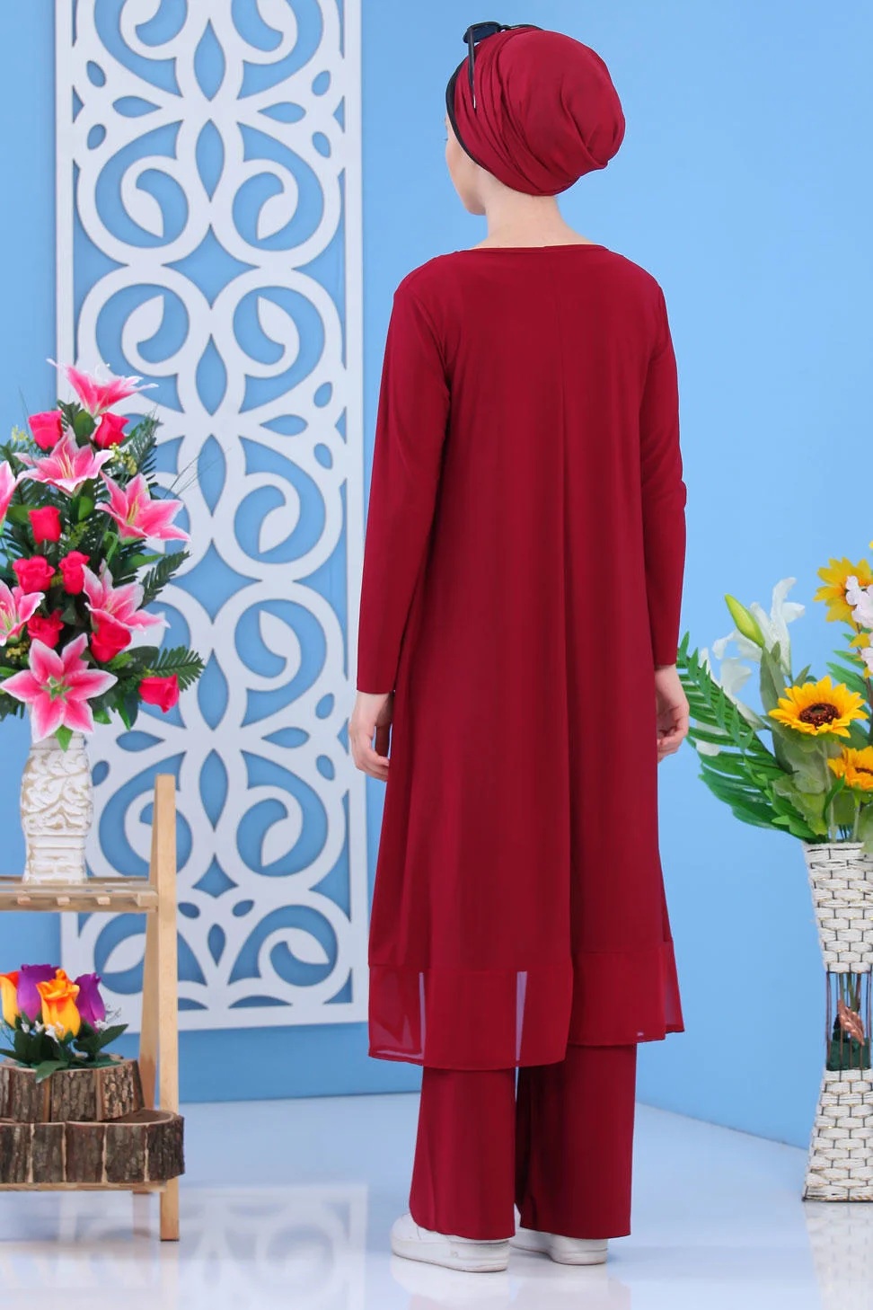 Tunique : Longueur : 110 cm - Tour de poitrine : 92 cm - Tour de taille : 114 cm - Tour de hanches : 148 cm. Pantalon : Longueur : 120 cm - Tour de taille : 72 cm