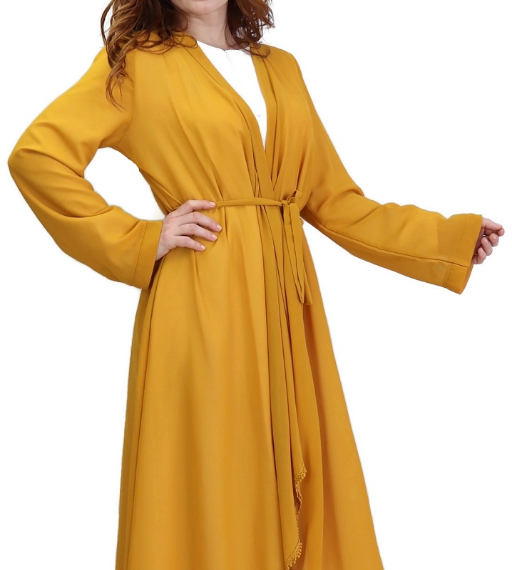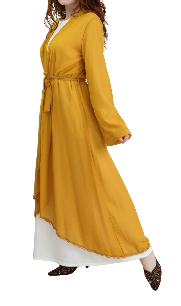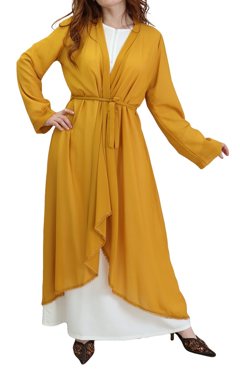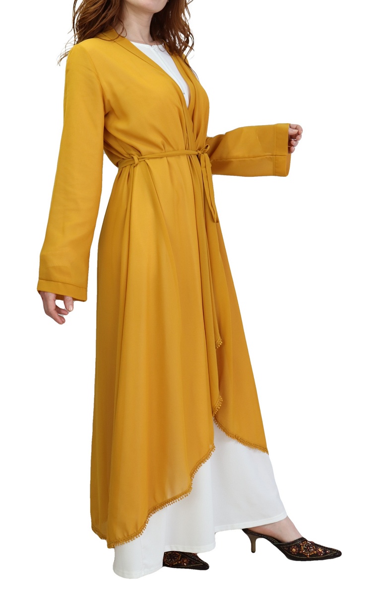 Kimono mi long devant et long derrière, ceinture assortie à passant pouvant se nouer à l'avant comme à l'arrière, broderies sur tout l'ourlet du bas, tissu léger et transparent. Il fait partie des indémodables et complète facilement vos tenues.