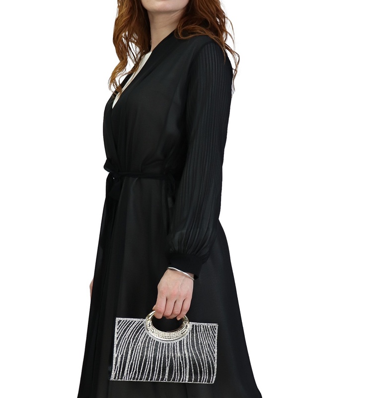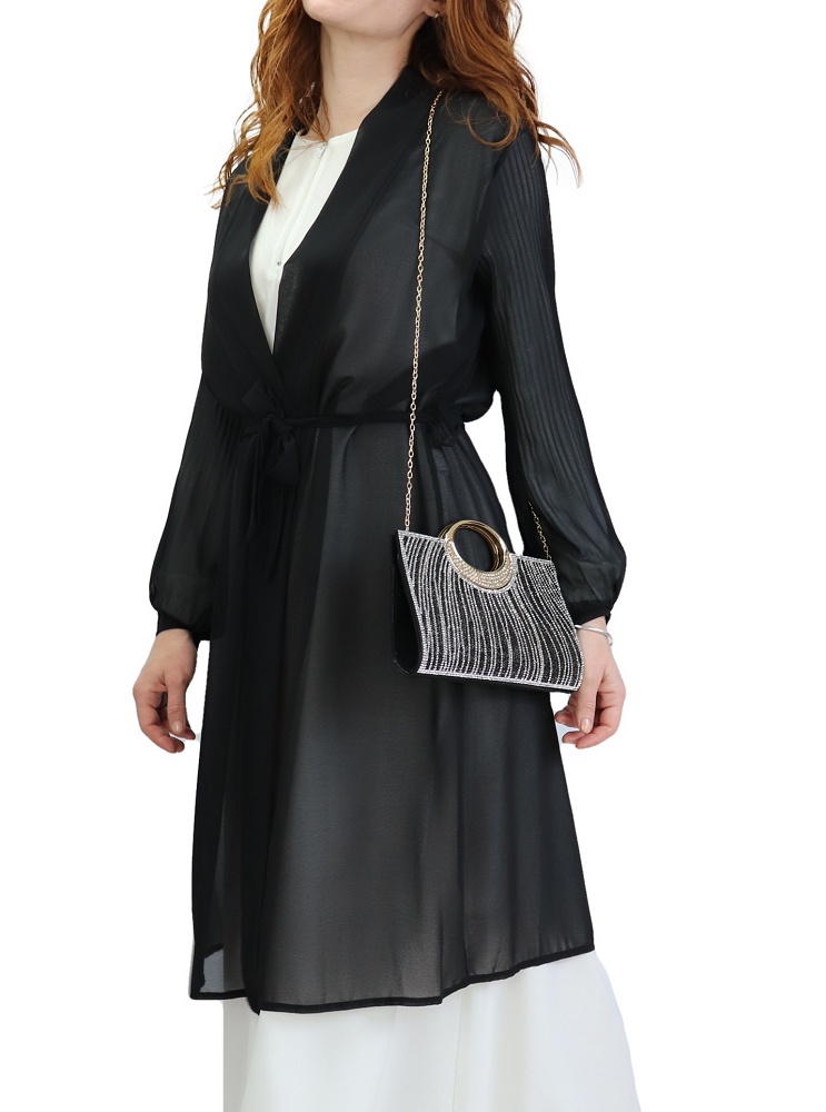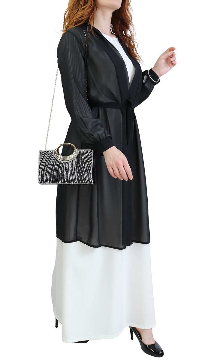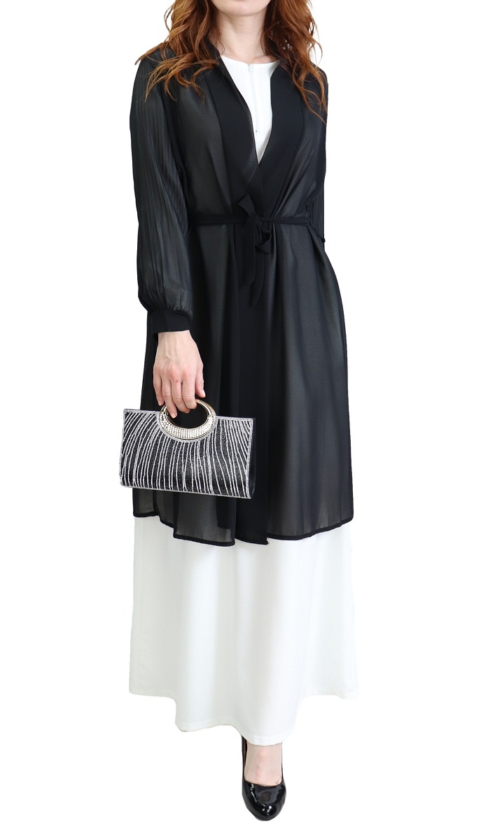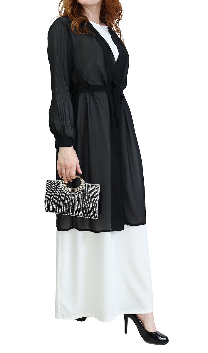 Kimono mi long, manches plissées finition boutons, ceinture ruban à passant, tissu fluide et transparent.