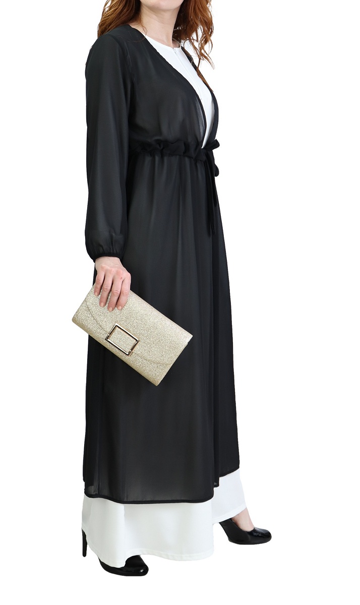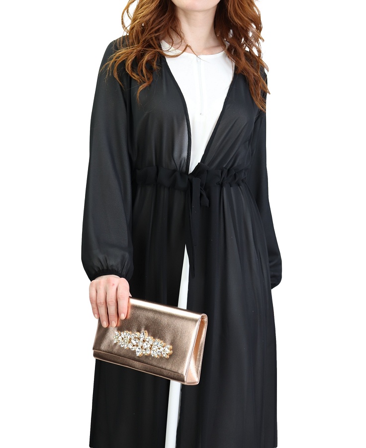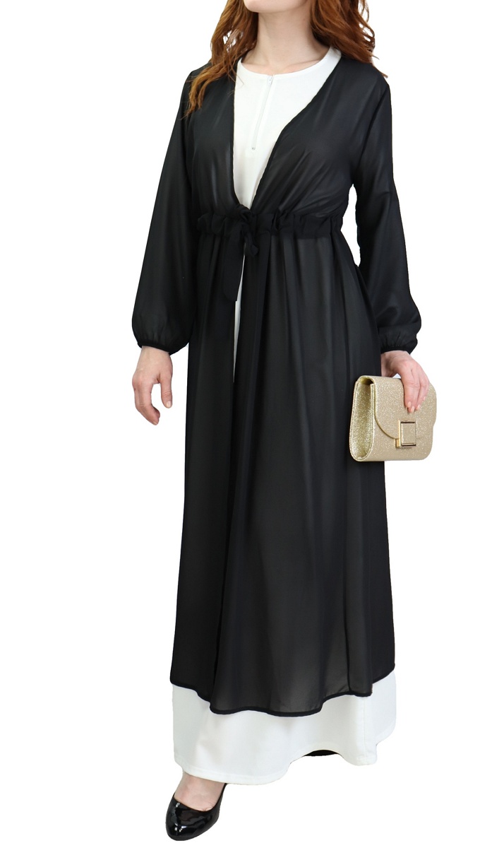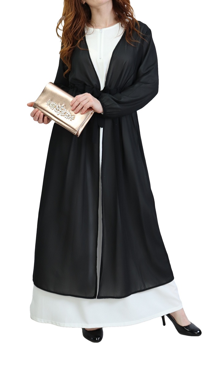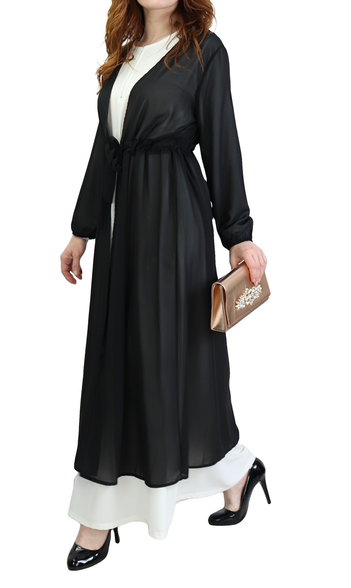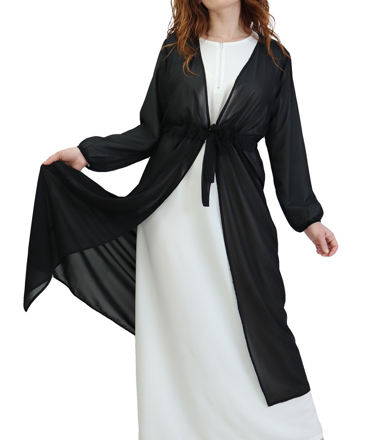 Kimono mi-long, manches légèrement bouffantes, ceinture intégrée, tissu fluide et légèrement transparent. Il fait partie des indémodables et complète facilement vos tenues.