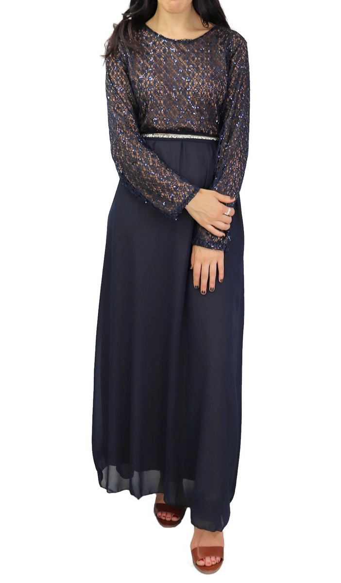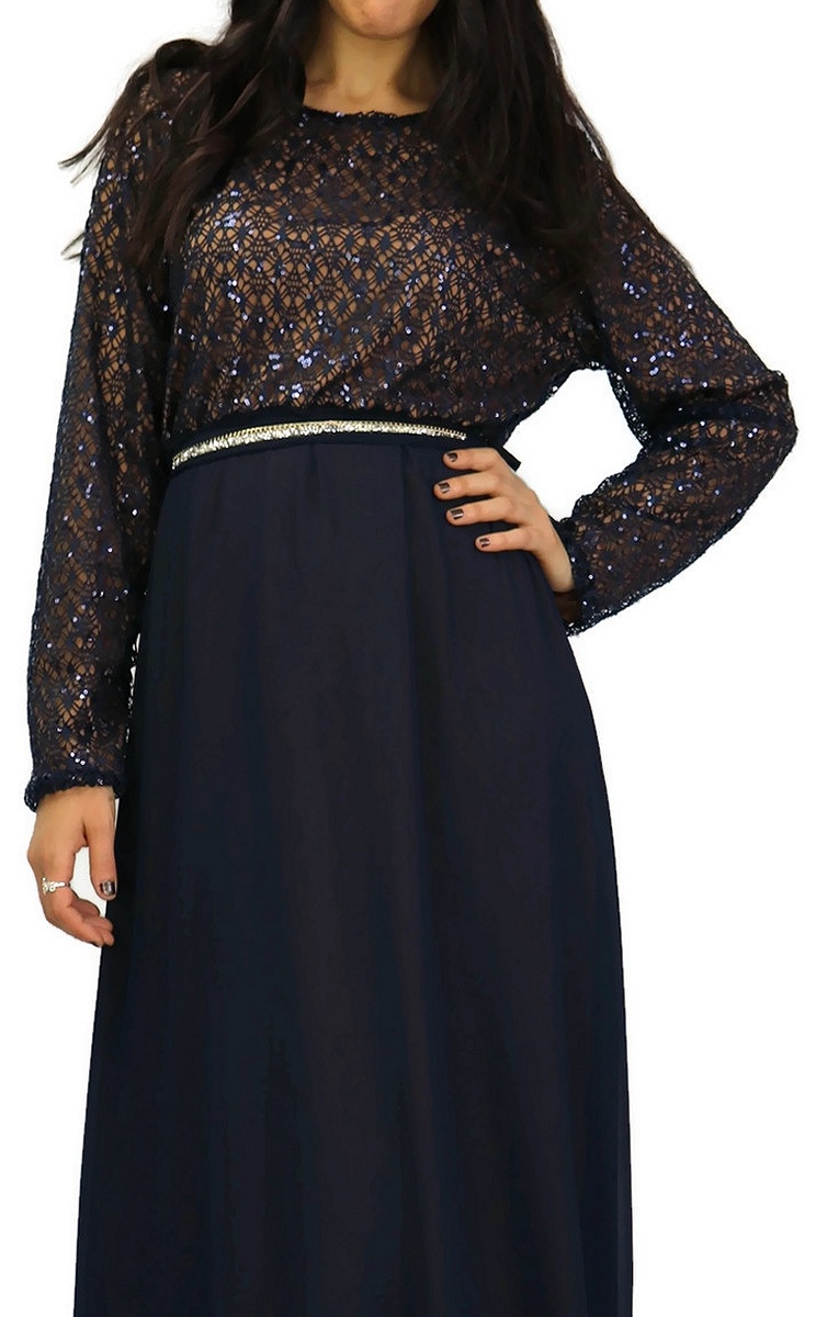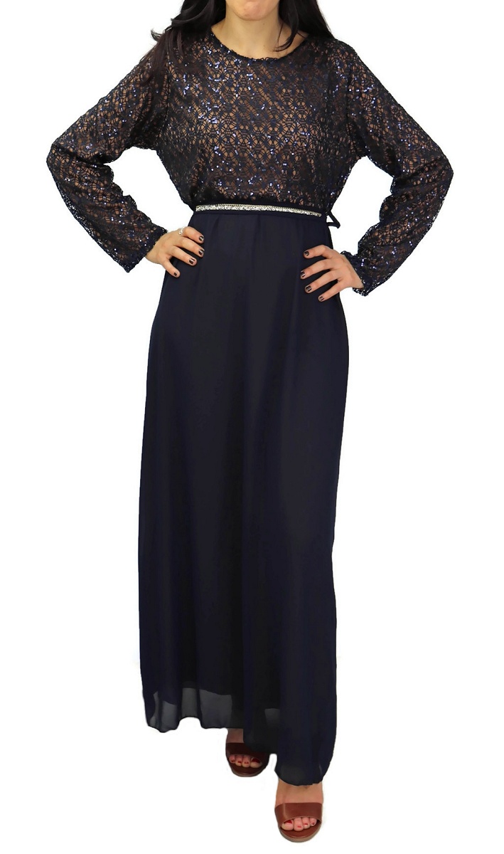 Robe longue évasée de couleur Bleu Marine, pailletée sur la partie haute? entièrement doublée (de couleur marron). La partie basse est faite en mousseline. Livrée avec sa ceinture assortie décorée de strass argentés et de chaines dorées.