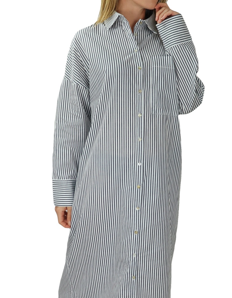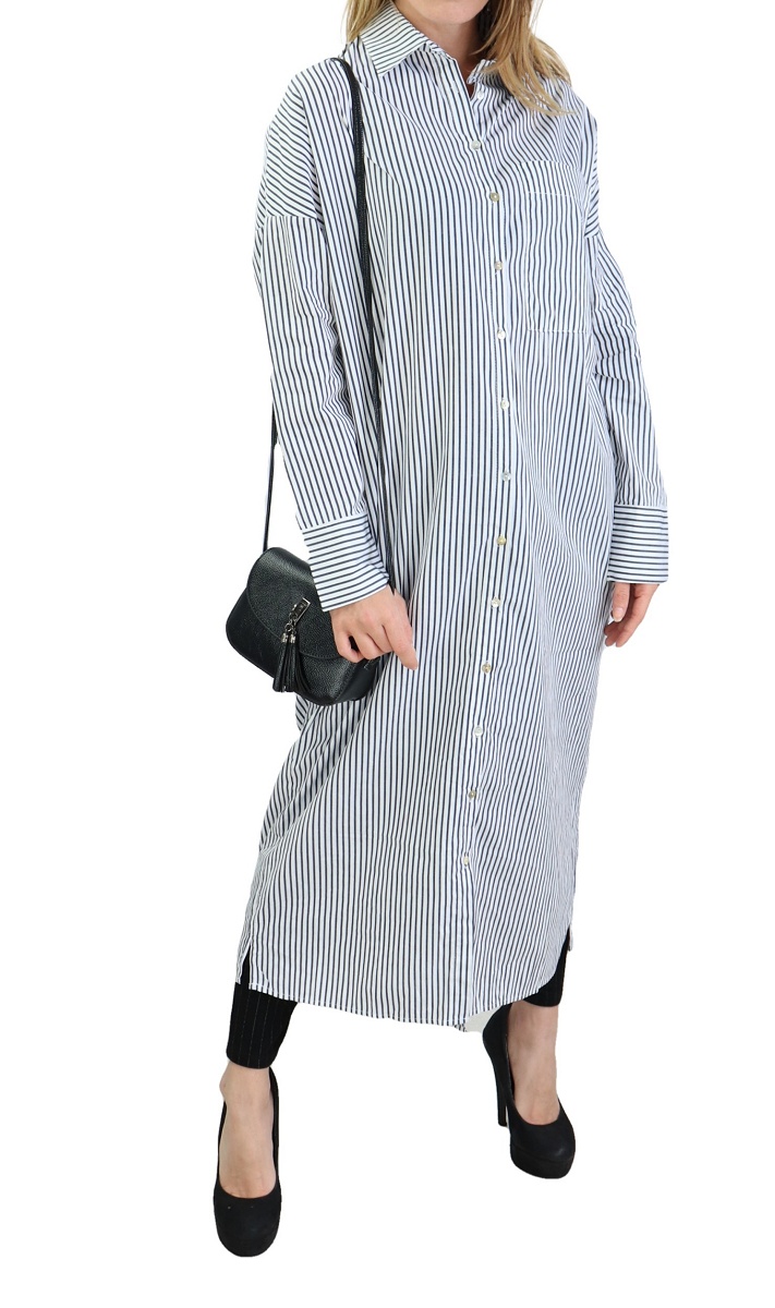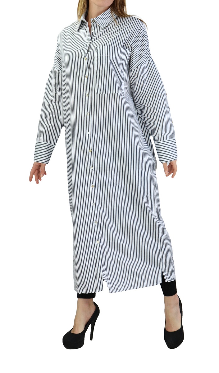 Robe chemise, col chemisier, poche plaquée, fermeture boutons, manches longues. Confectionnée pour les personnes qui veulent allier robe et chemise. Les rayures restent une valeur sure et indémodable.