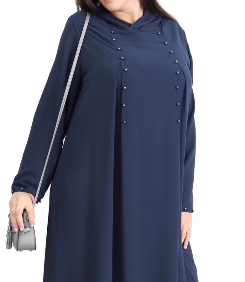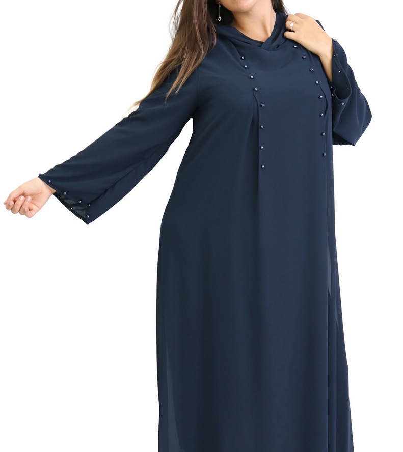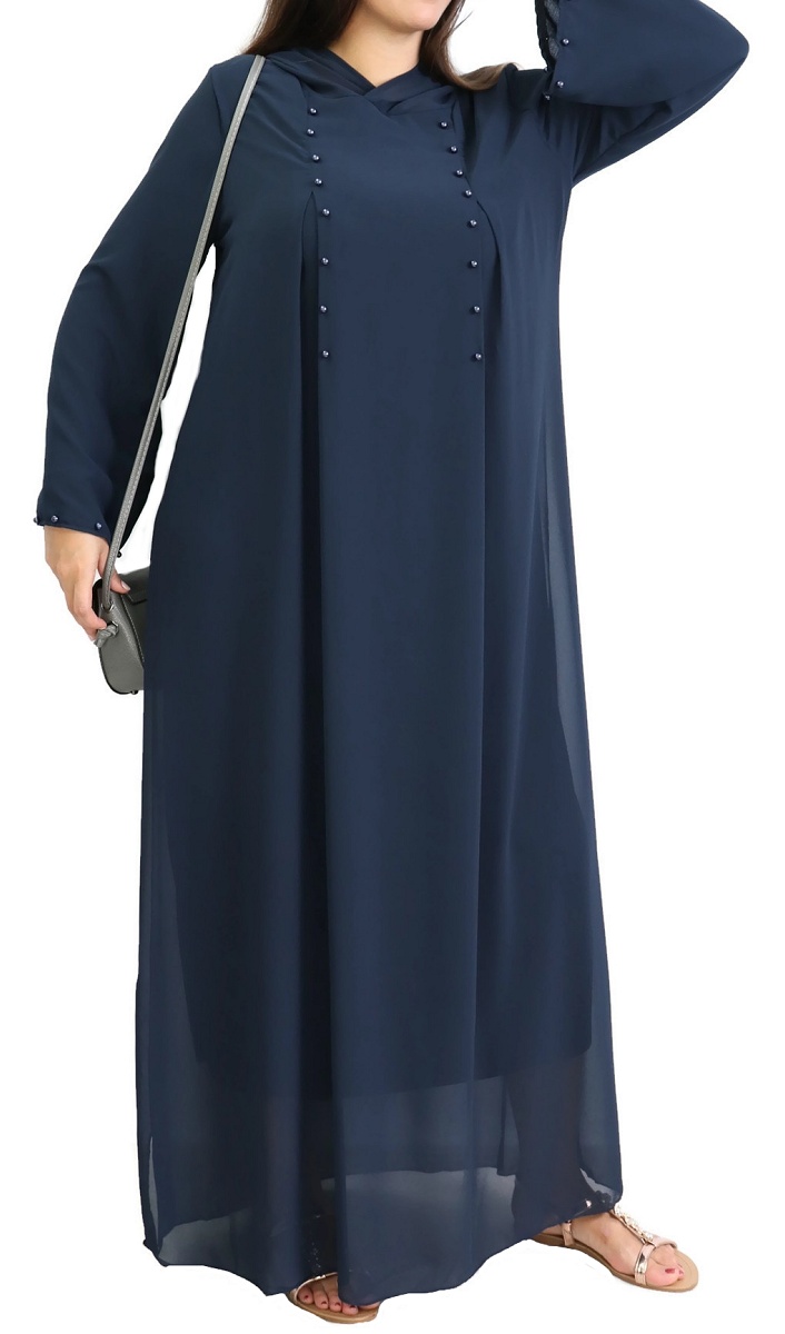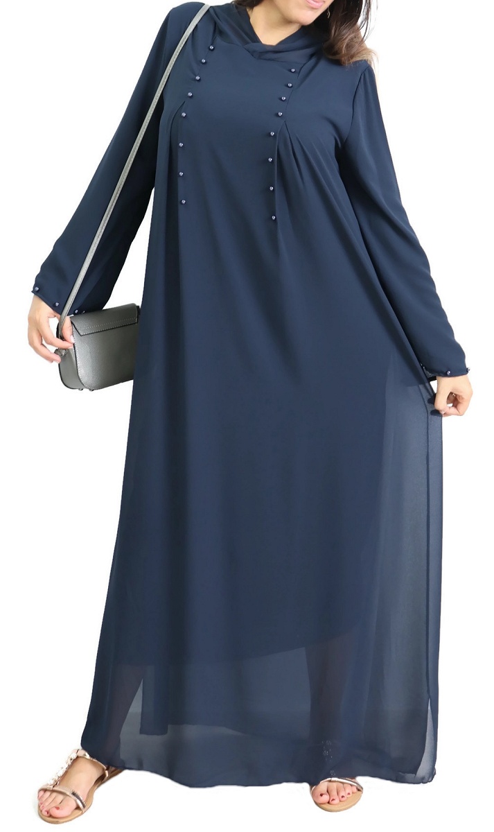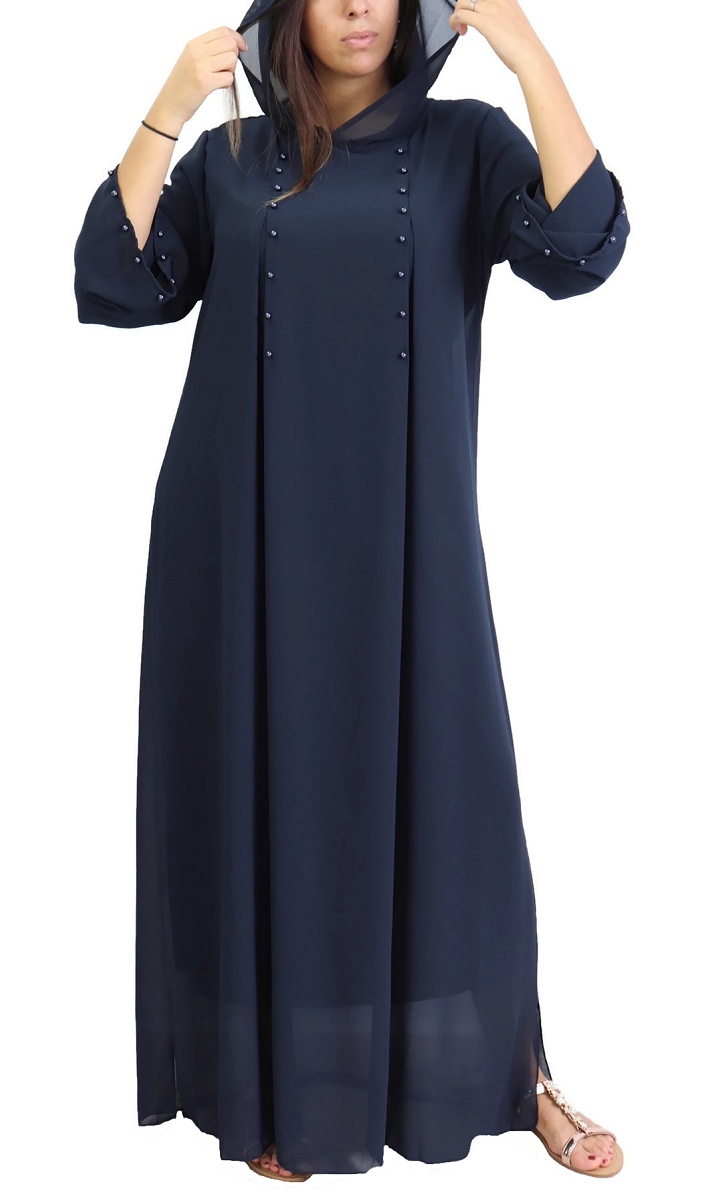 Robe longue, col capuche, entièrement doublée, manches longues, orné des perles sur le devant ainsi que les poignets. Sobre et élégant, Cette tenue s’accommode pour diverses occasions aussi bien festives que quotidiennes.