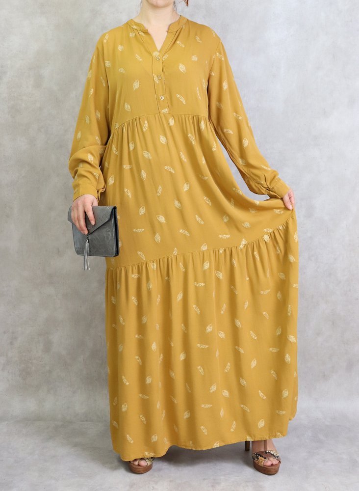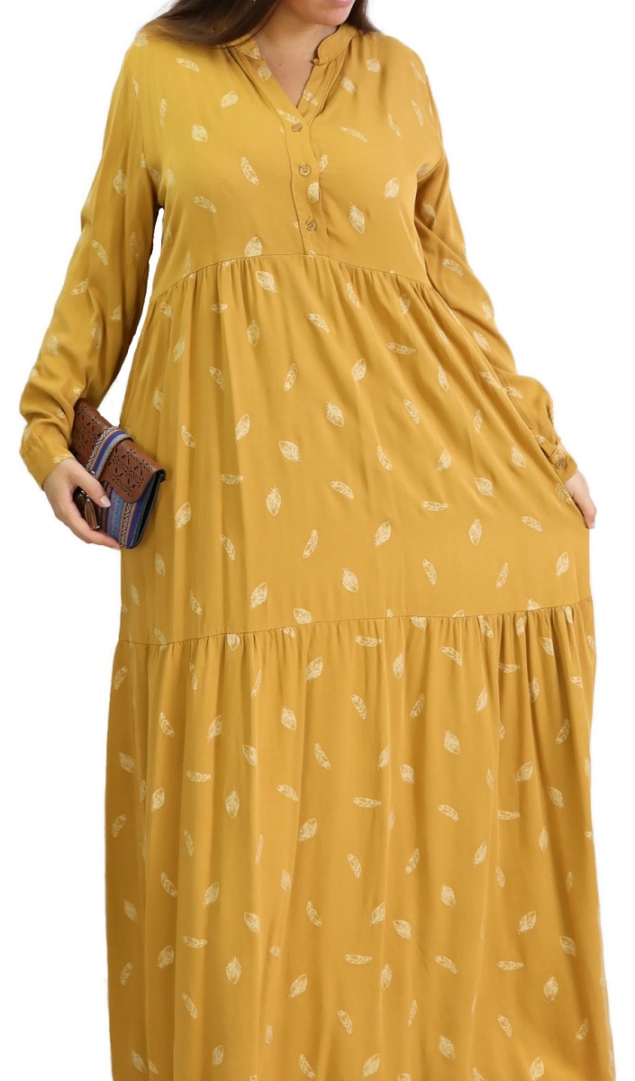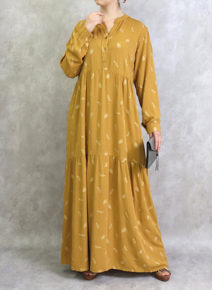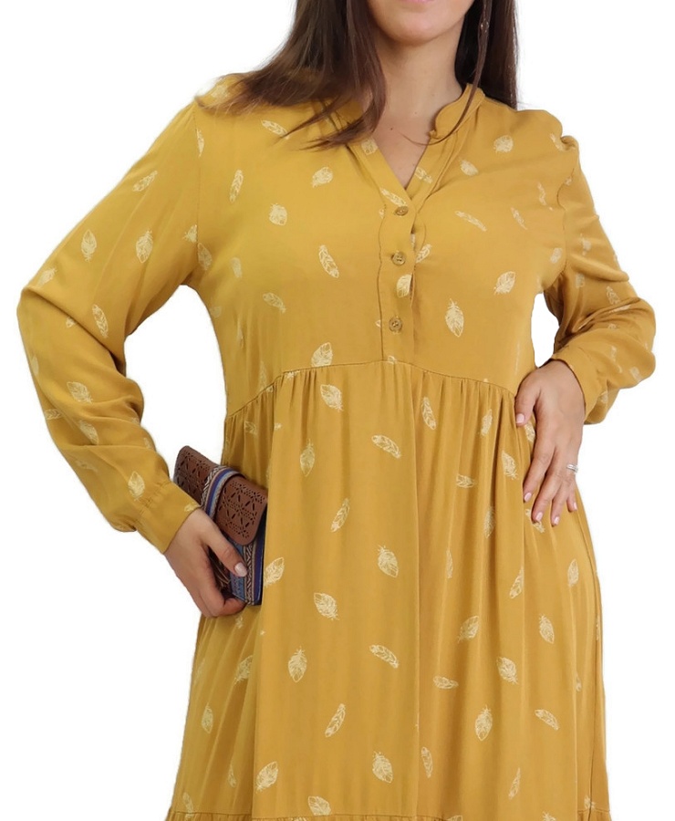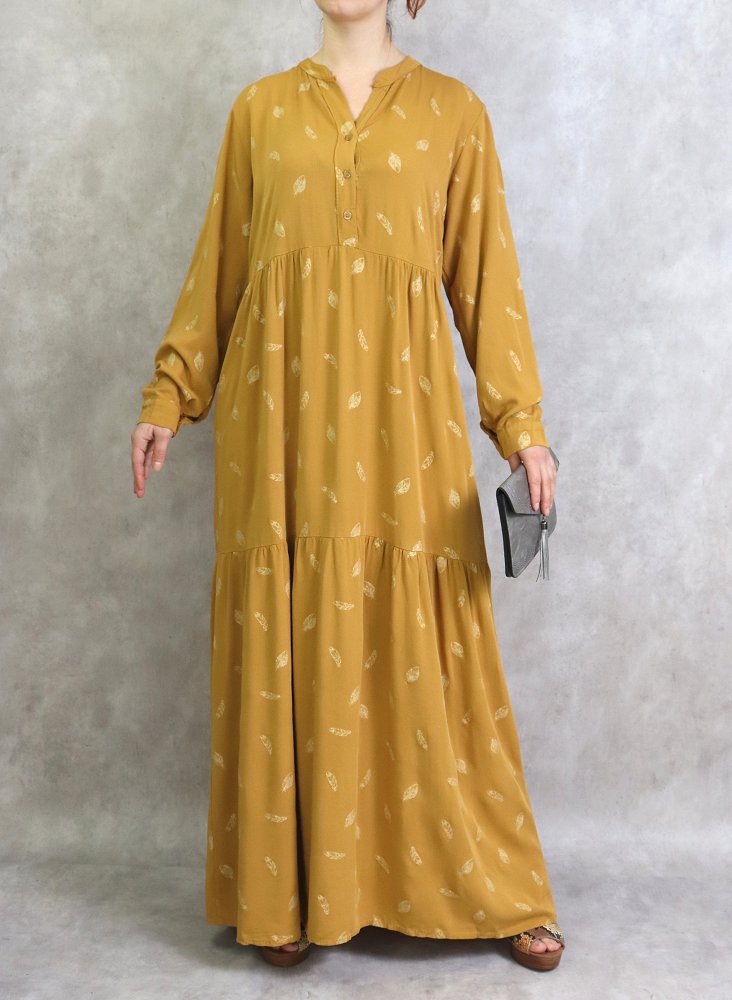 Robe tendance à motifs plume, manches longues, col Mao entre ouvert finition boutons. Coupe évasée légèrement cintrée à la taille et un effet volant à mi longueur.