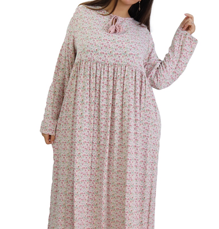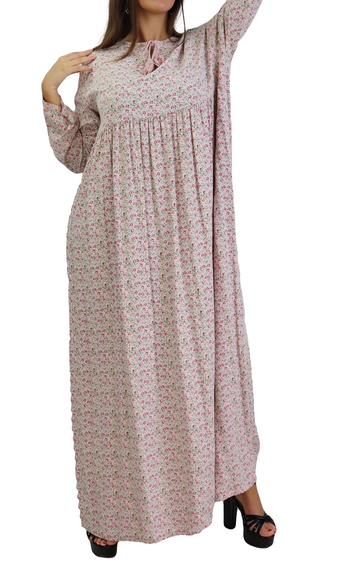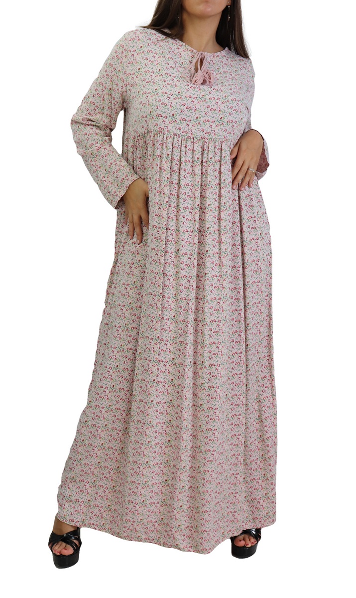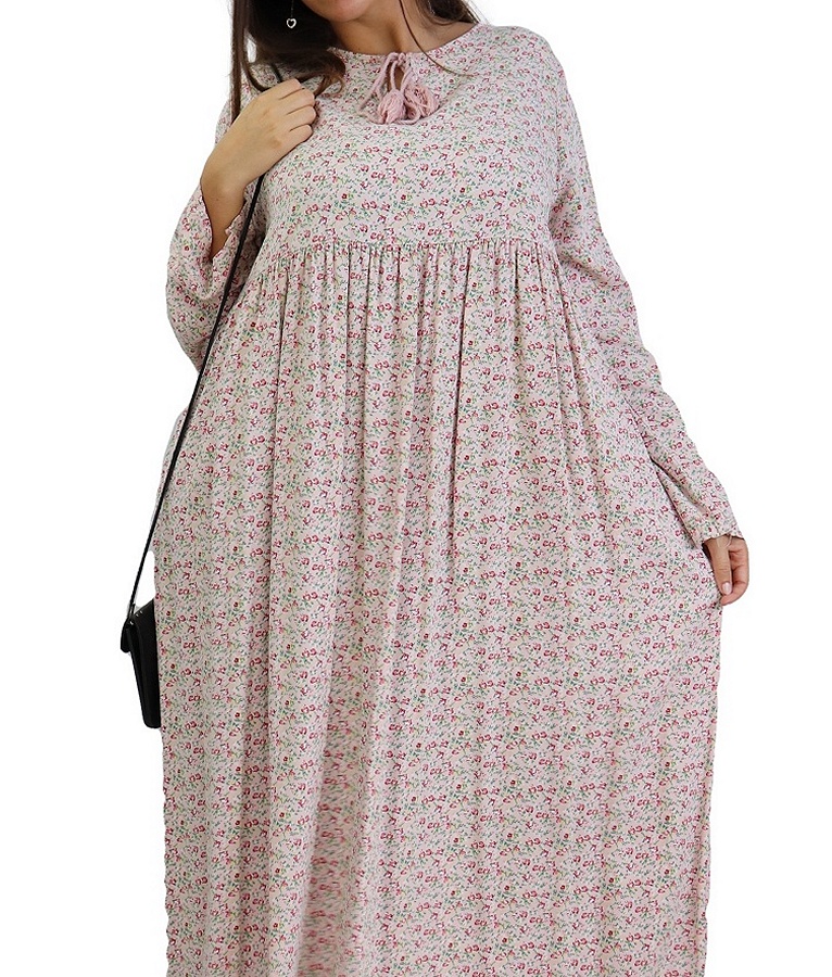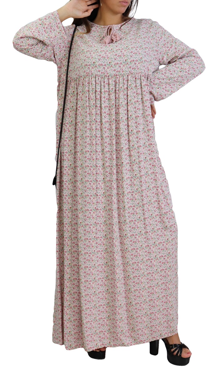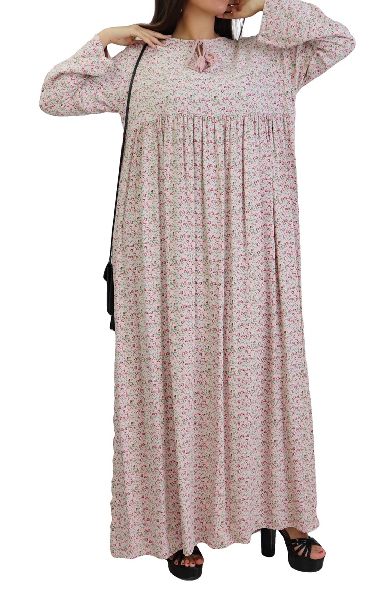 Robe longue, col rond dotée de cordons avec pompons, manches longues, tissu fluide et opaque, à porter au quotidien. La robe évasée flatte toutes les silhouettes. Elle séduit avec effets volantés, essentielle dans votre garde-robe !
