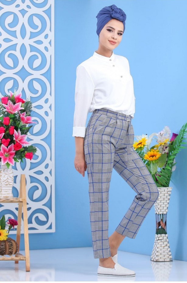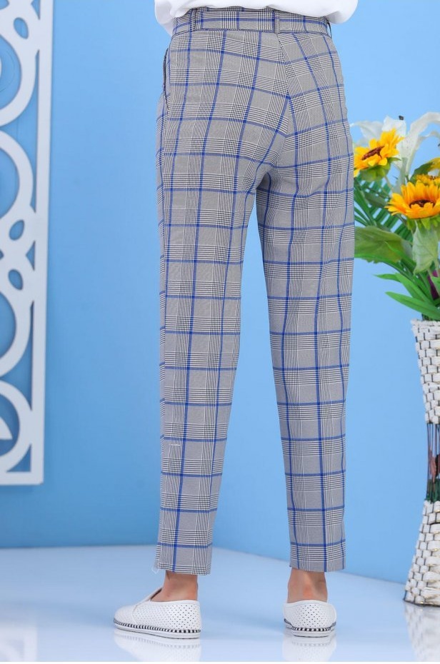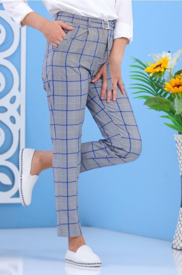 Pantalon à carreaux avec plis pour femme - Couleur Bleu Vetement & Accessoire