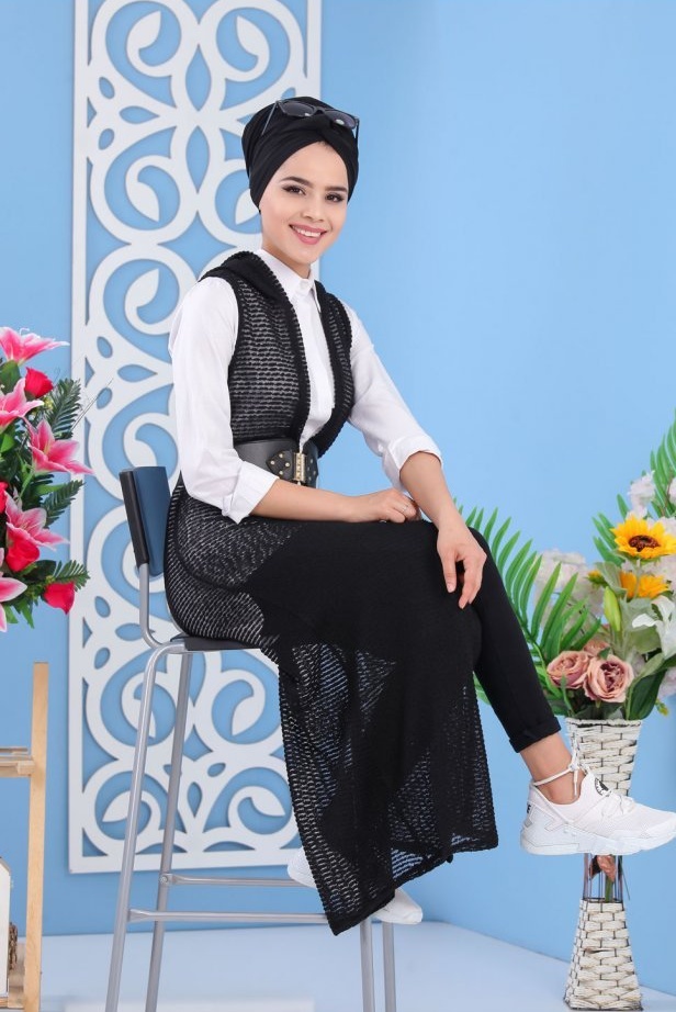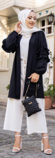 Gilet Veste long col châle manches à froufrou (Look tendance et style Hijabista) - Couleur Noir - REF. 33938 (25.00 €)