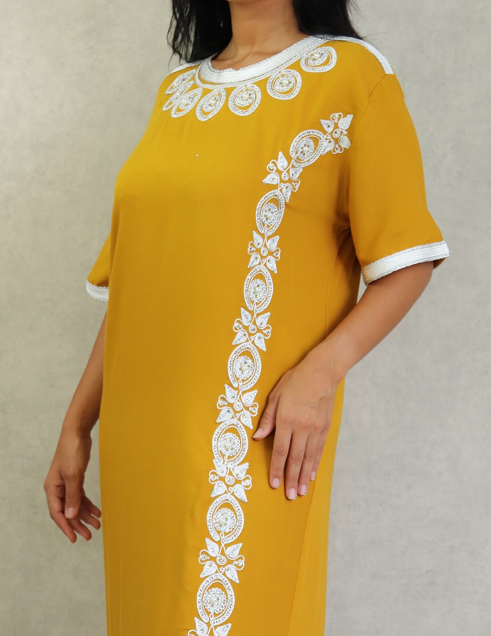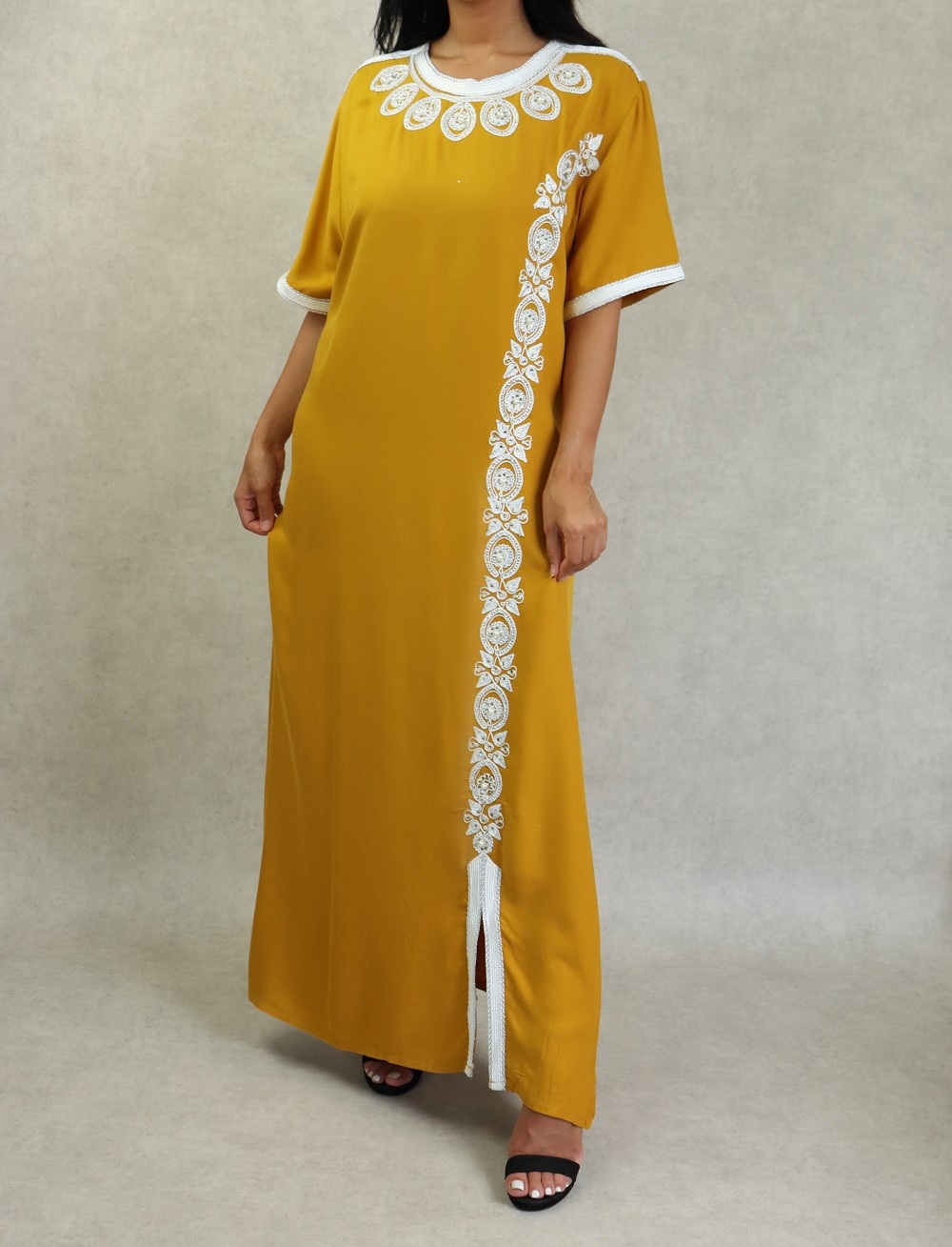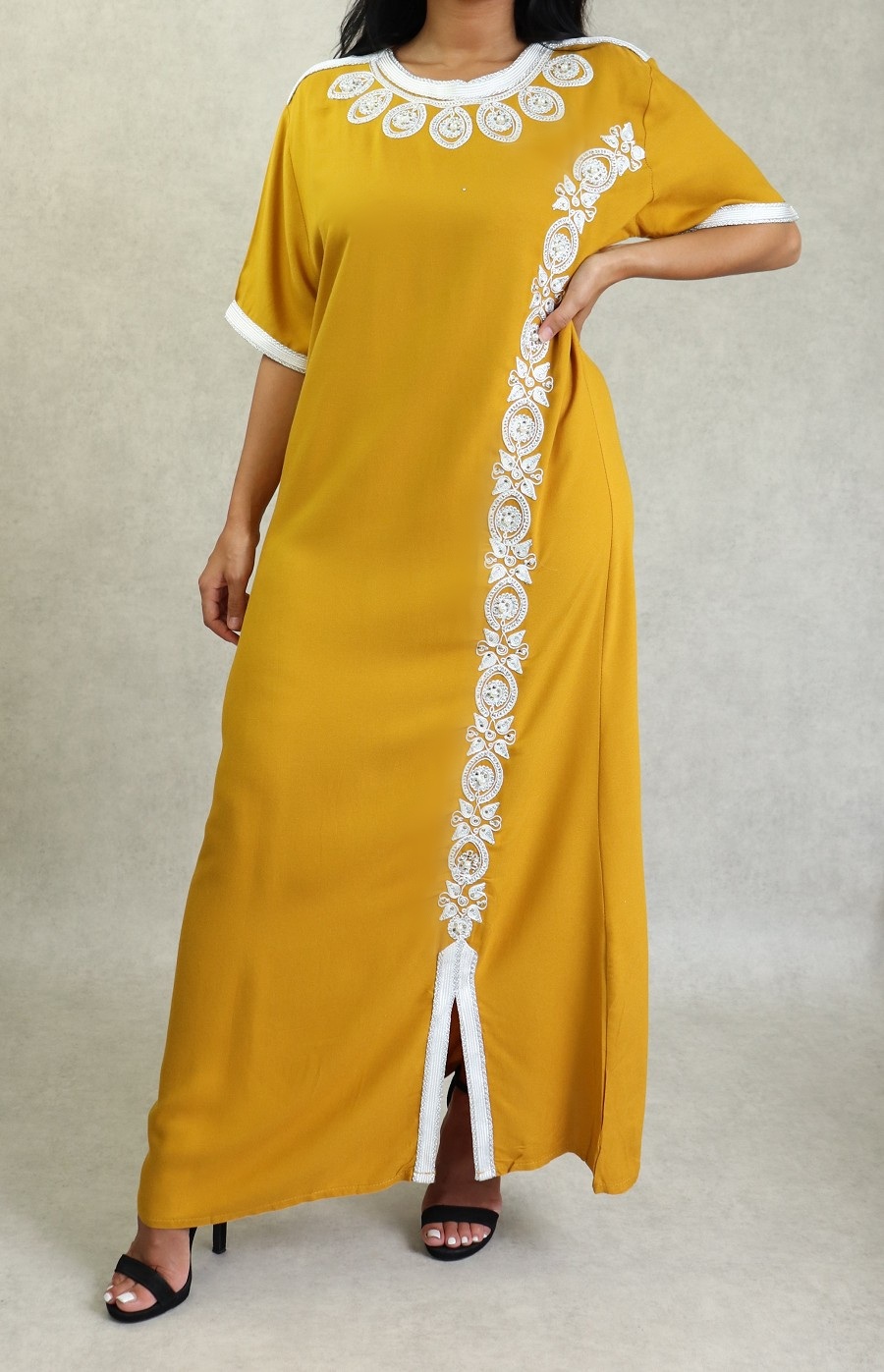 Belle robe style oriental à manches courte avec broderies de qualité sur l'encolure et toute la longueur. Tenue sobre et élégante, parfaite pour occasions et événements.