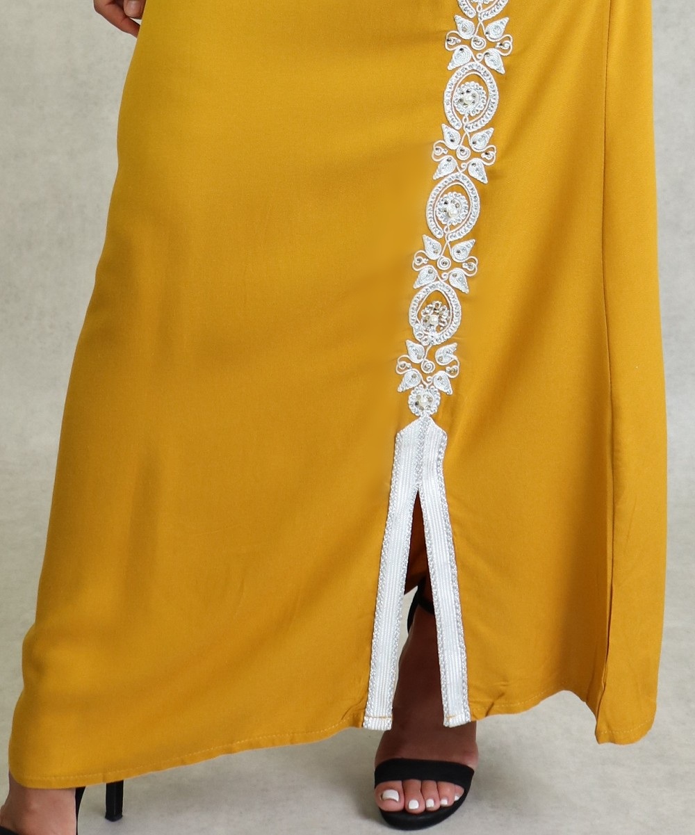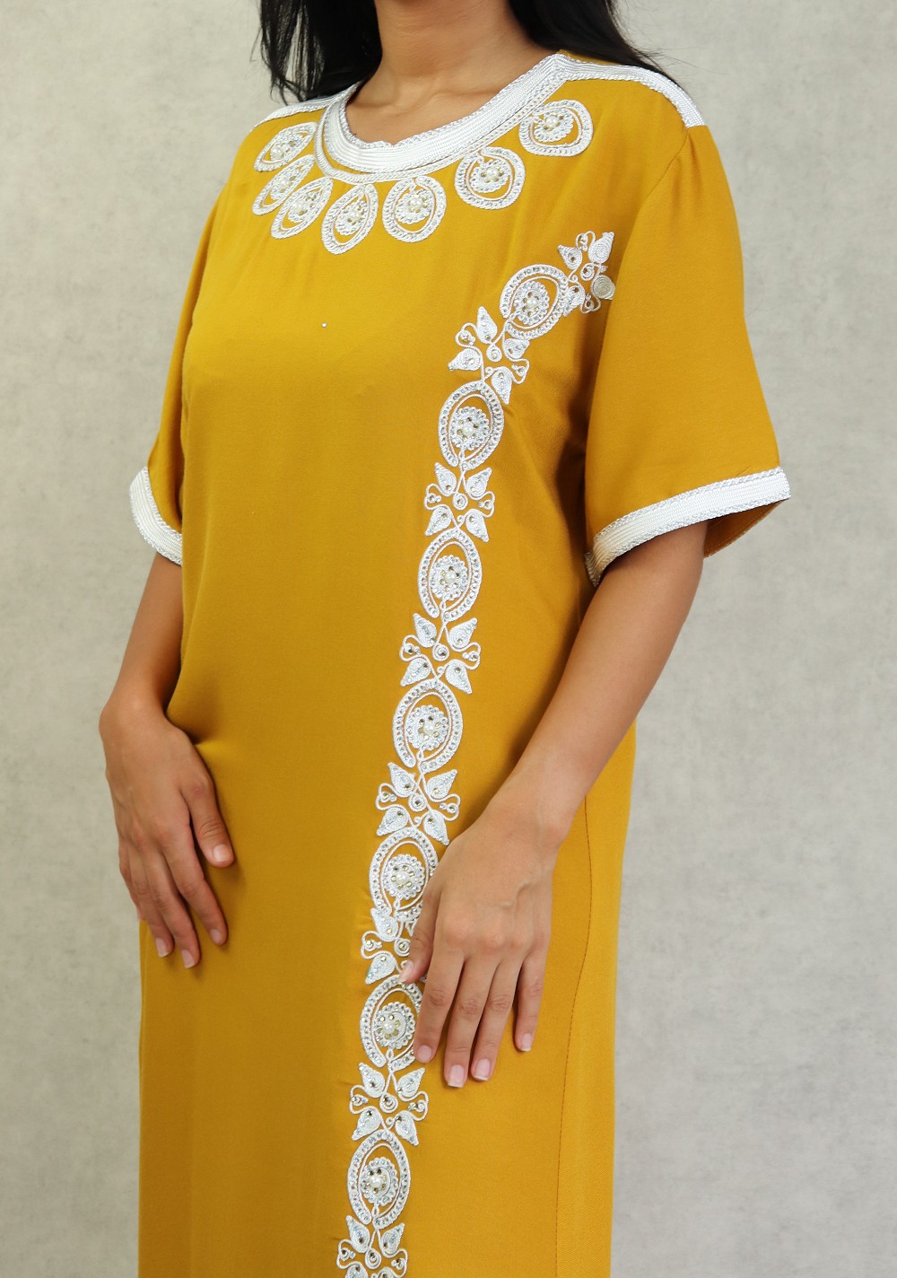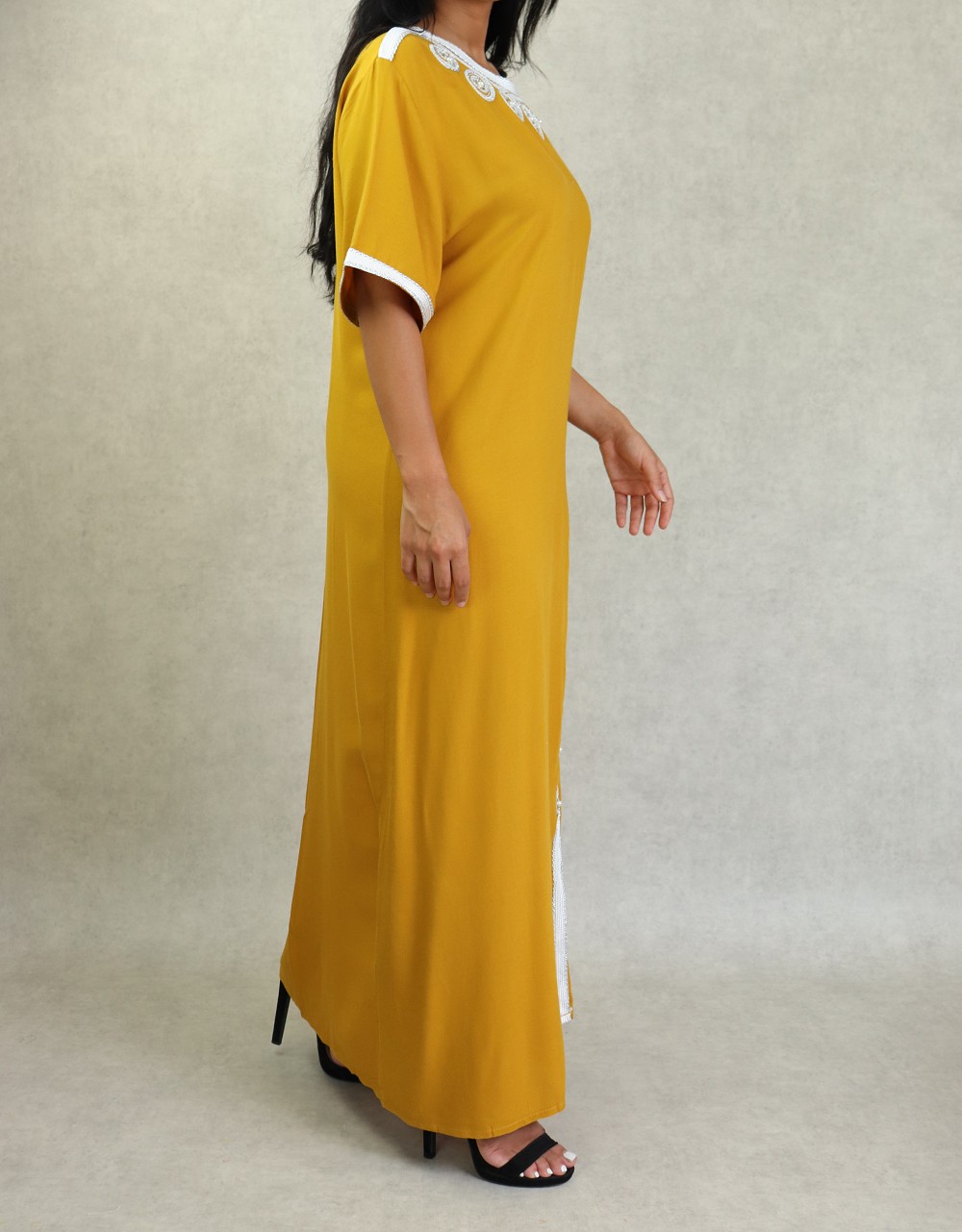 Belle robe style oriental à manches courte avec broderies de qualité sur l'encolure et toute la longueur. Tenue sobre et élégante, parfaite pour occasions et événements.