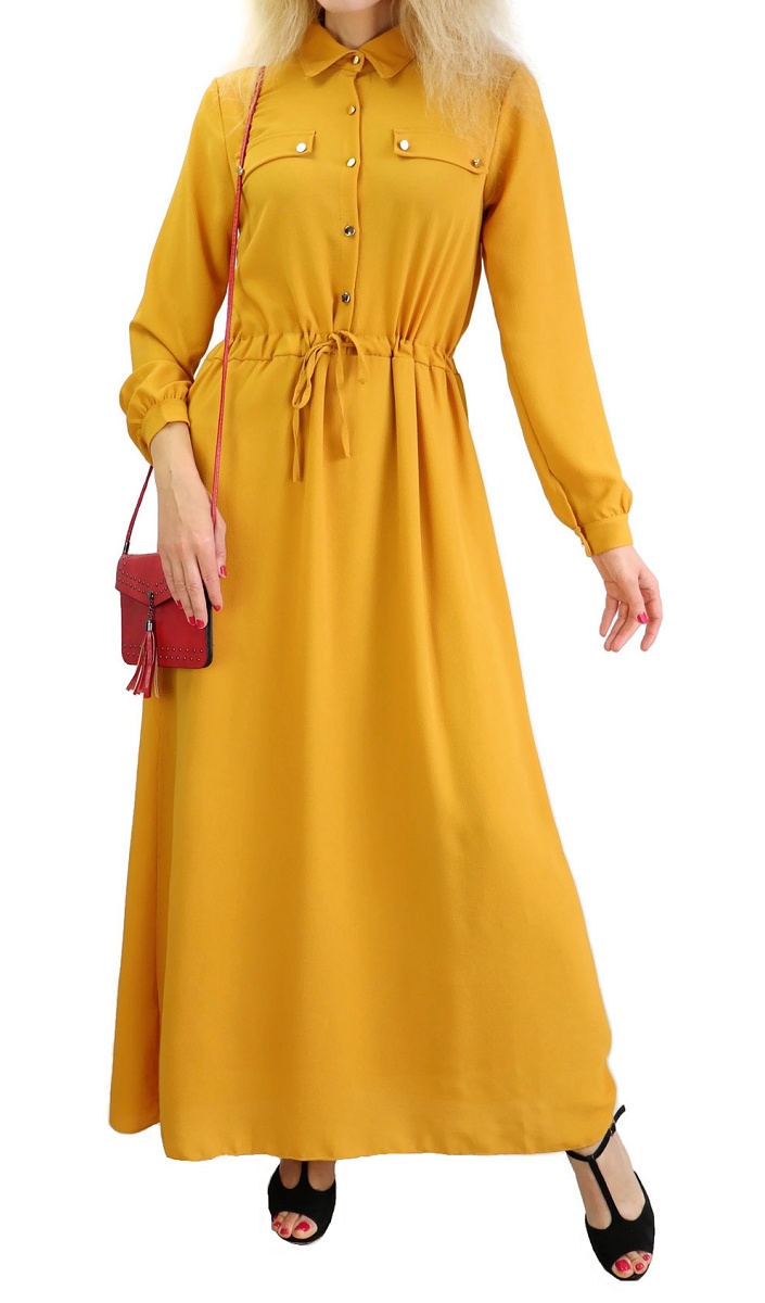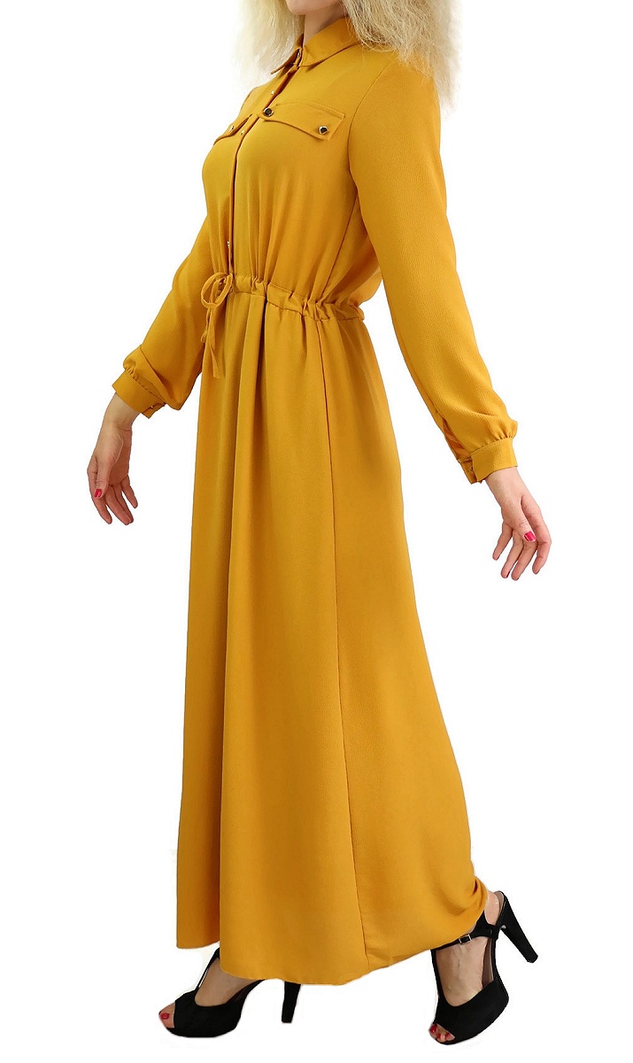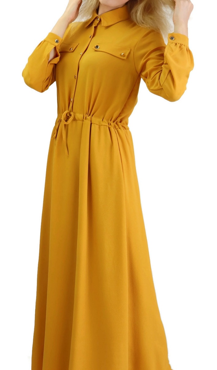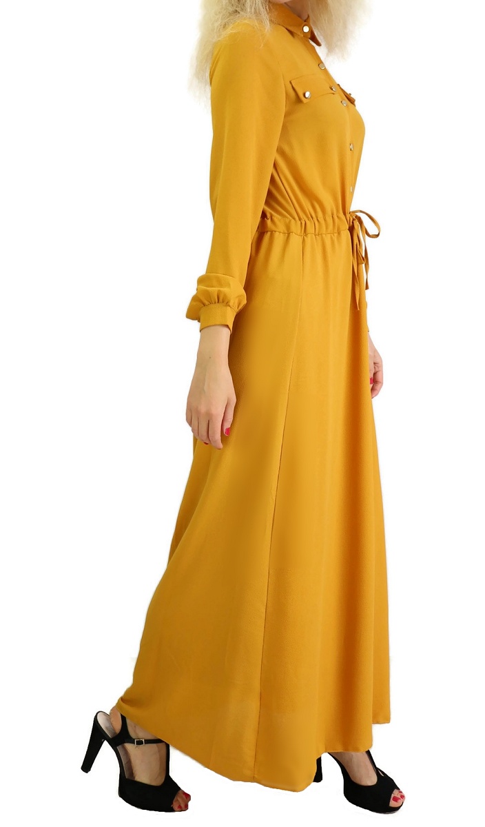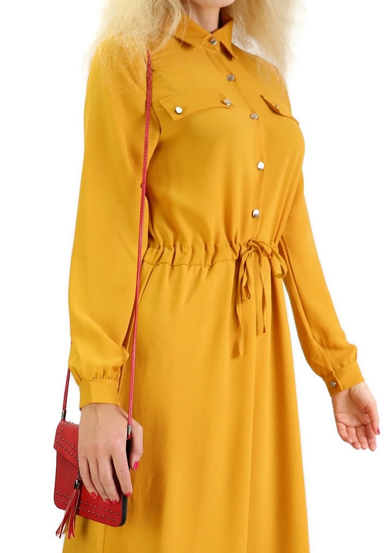 Robe casual boutonnée manches longues pour femme - Couleur Jaune moutarde Vetement & Accessoire