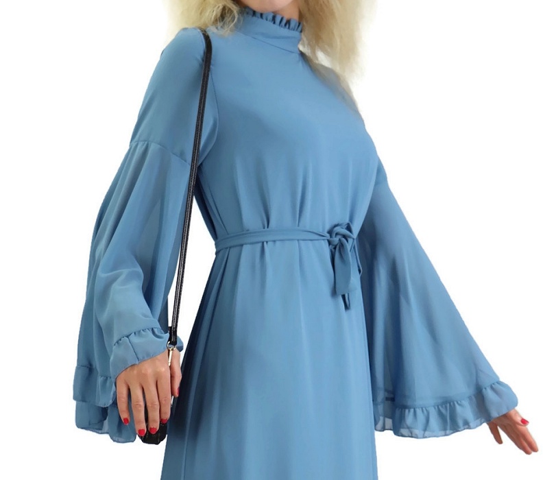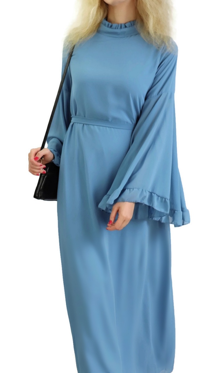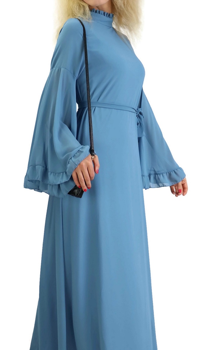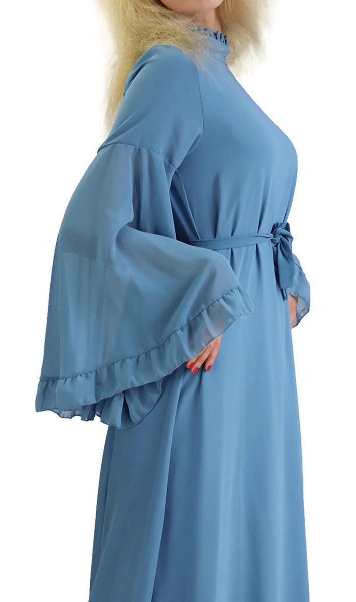 Robe longue, manches évasées, col volanté, fermeture bouton derrière, ceinture fournie ajustable, entièrement doublée (sauf aux manches), tissu effet mousseline.