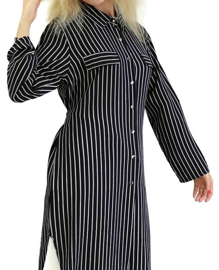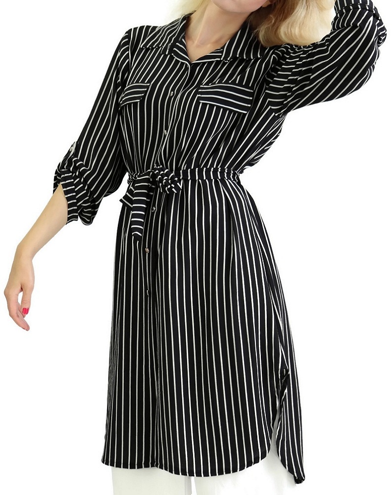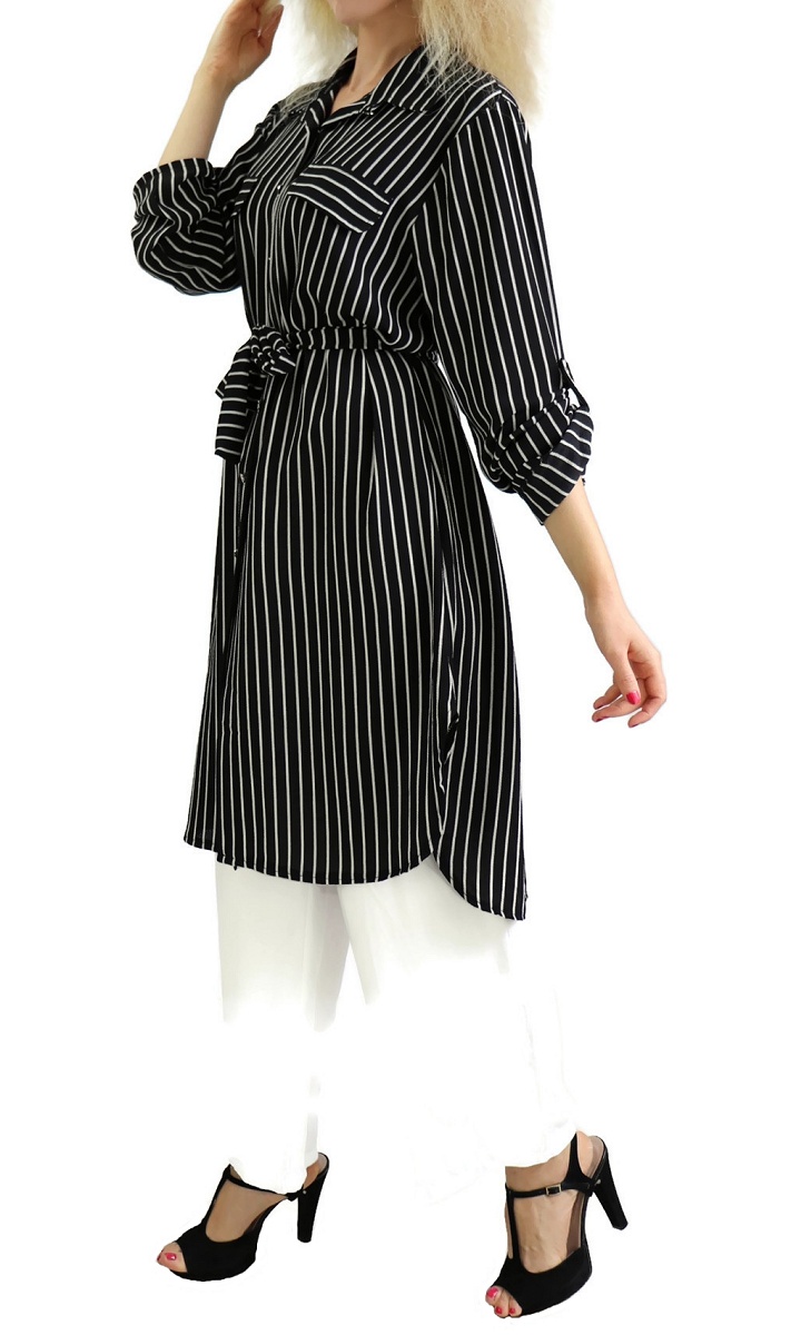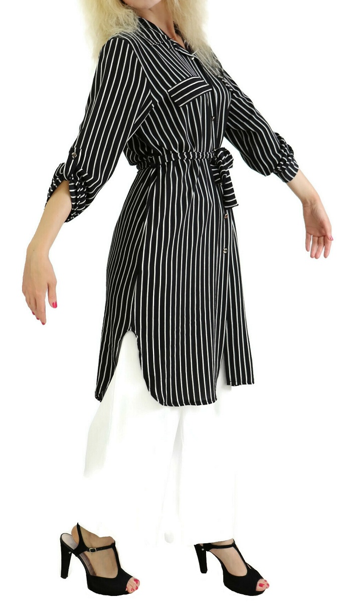 Chemise longue, manches ajustables, fermeture boutons, deux fausses poches plaquées, ceinture assortie, tissu effet crêpe, coupe droite.