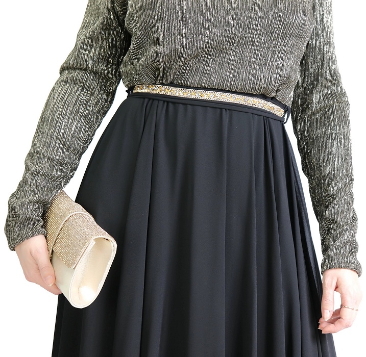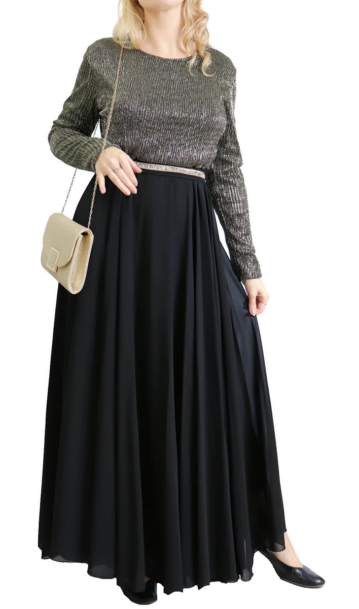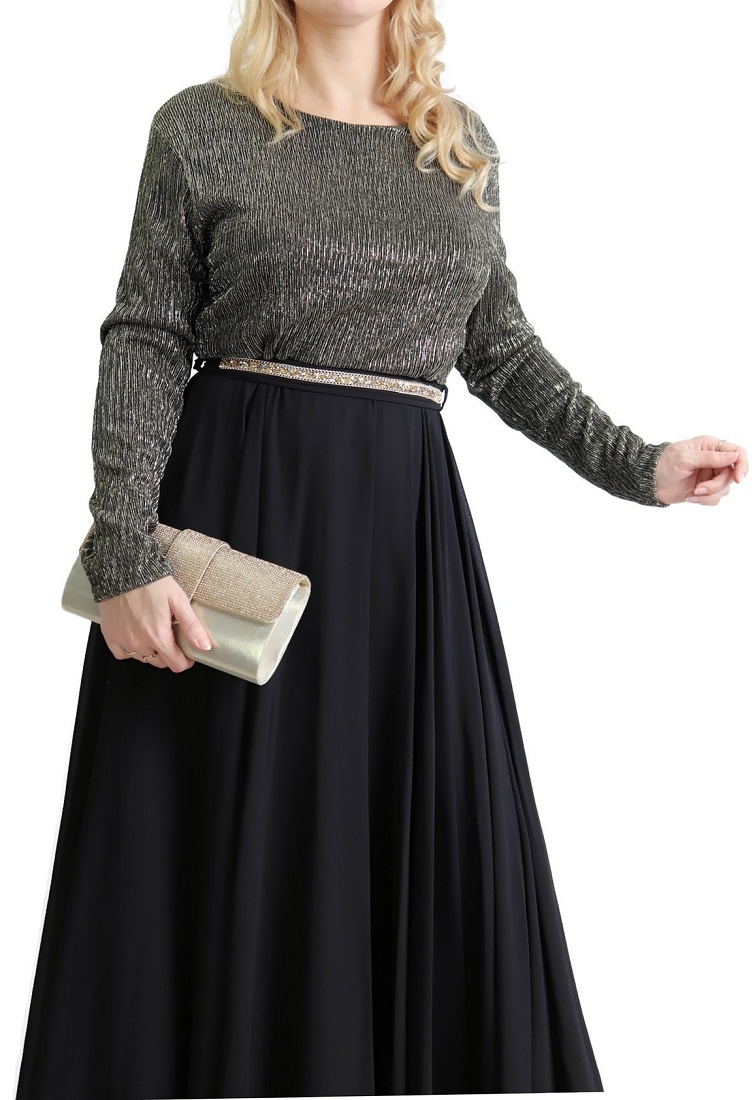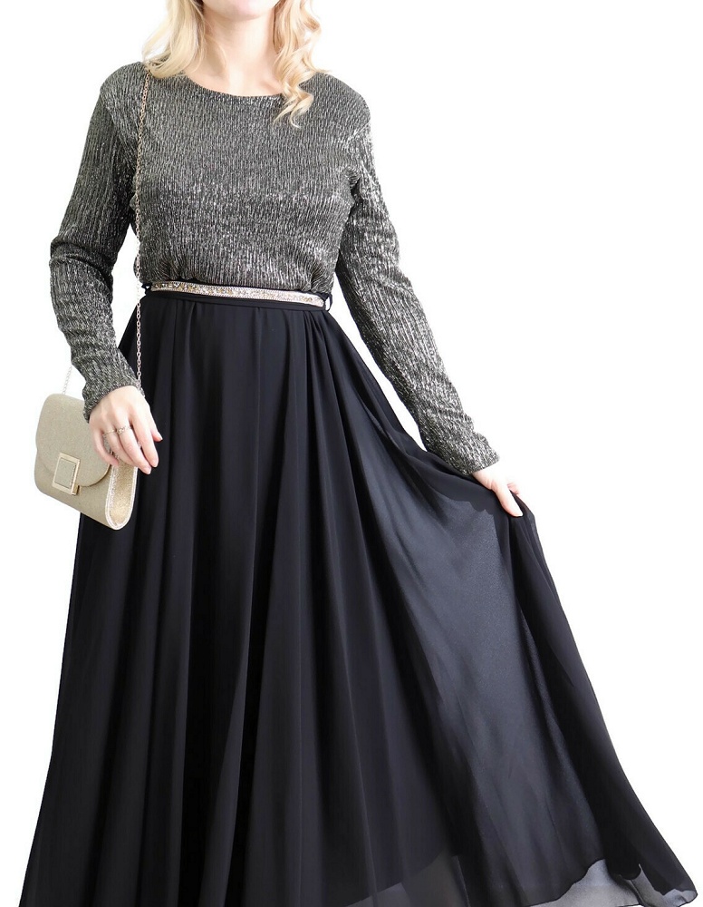 Robe de soirée maxi-longue haut brillant à manches longues - Couleur Noir et argenté Vetement & Accessoire