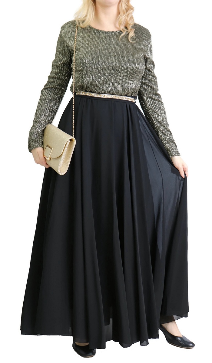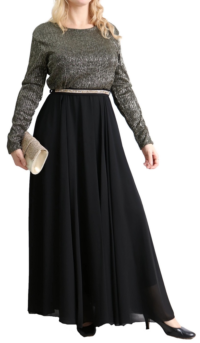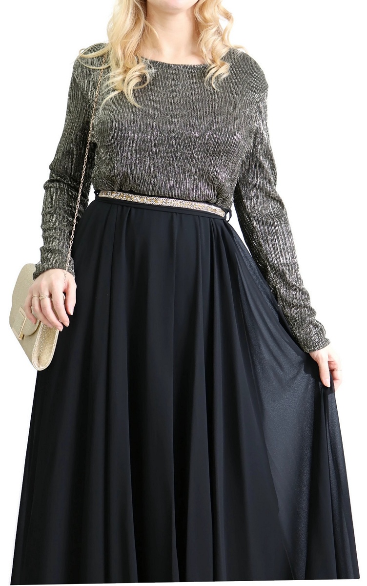 Robe de soiree maxi-longue haut brillant a manches longues - Couleur Noir et argente