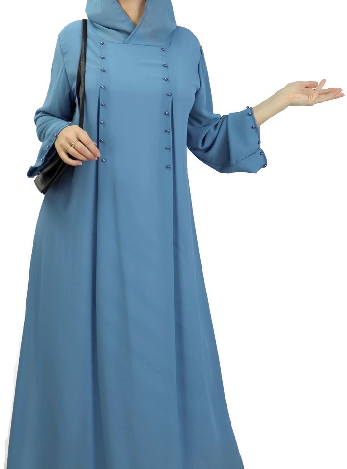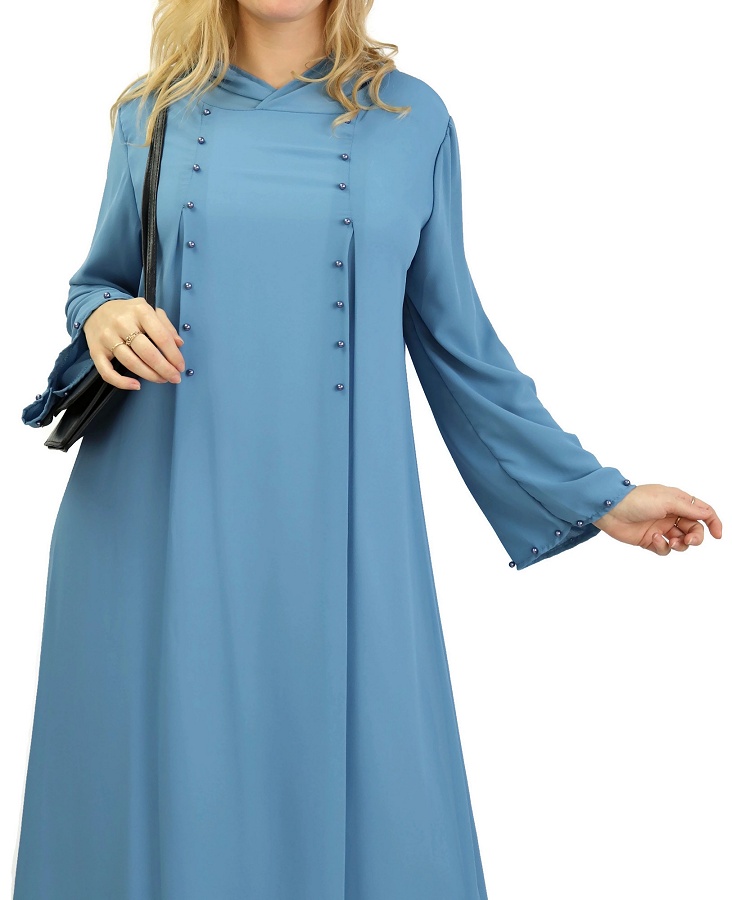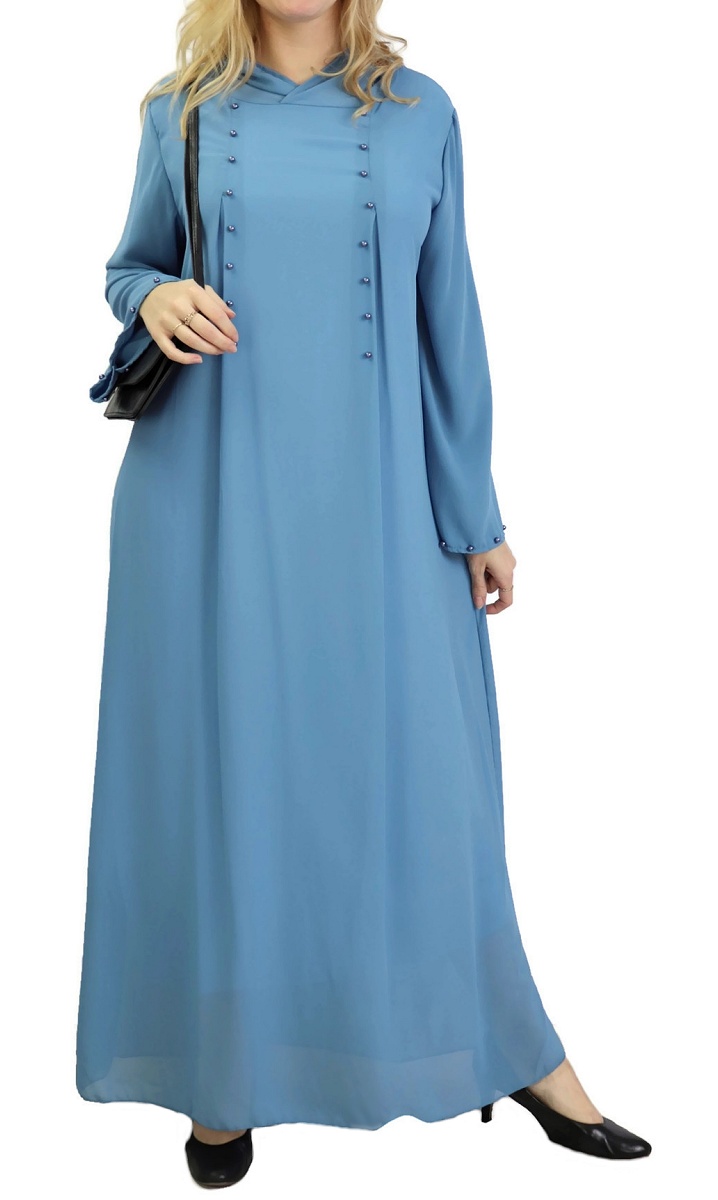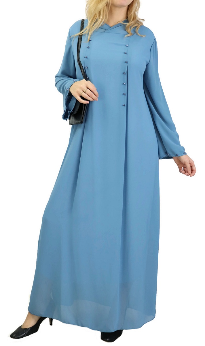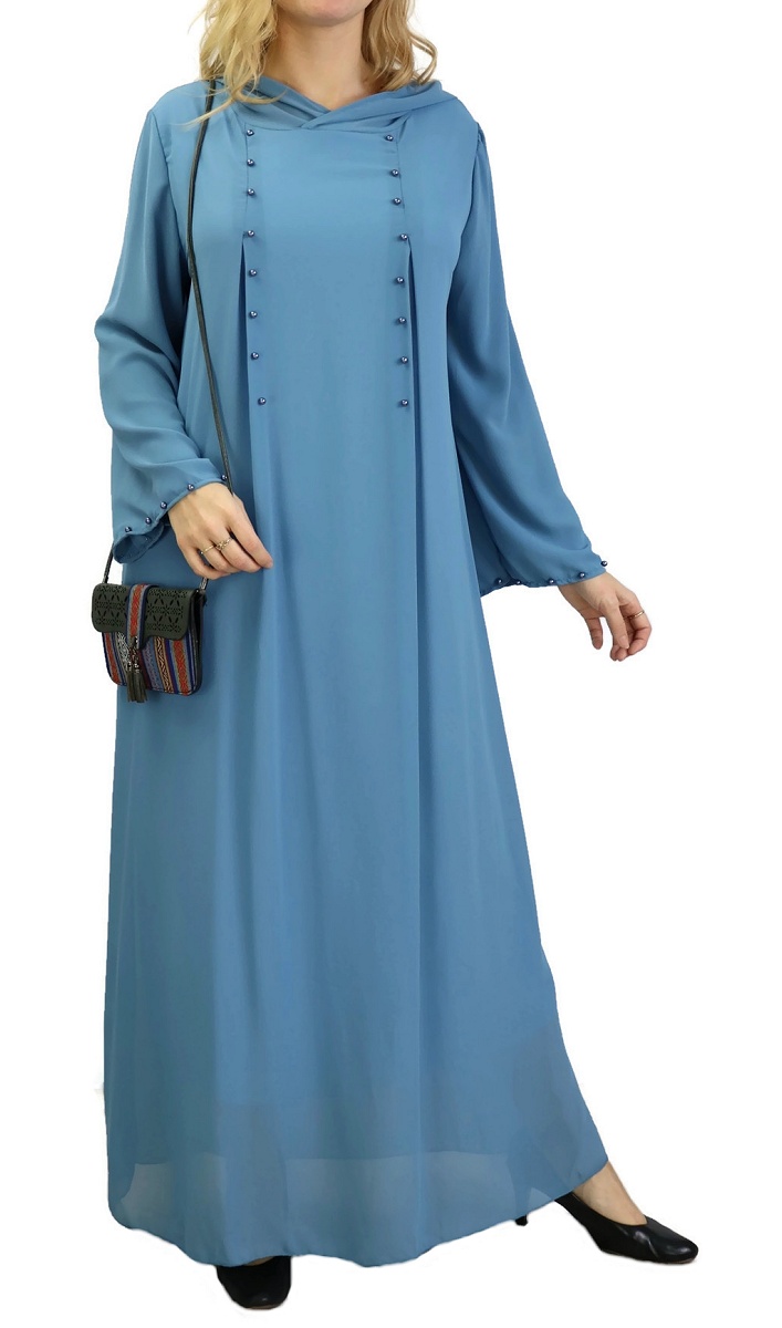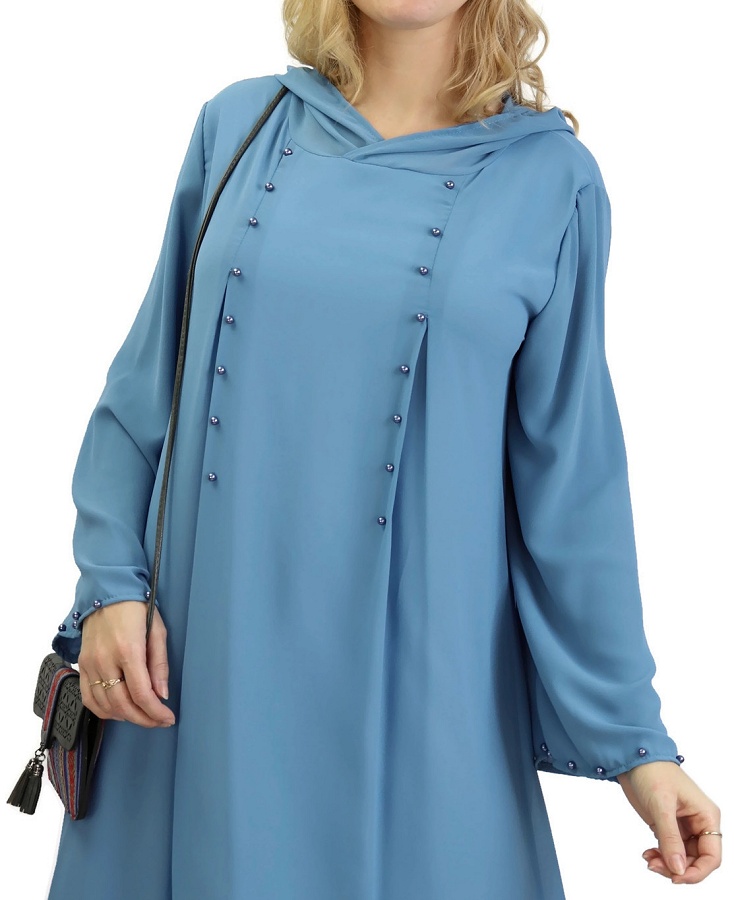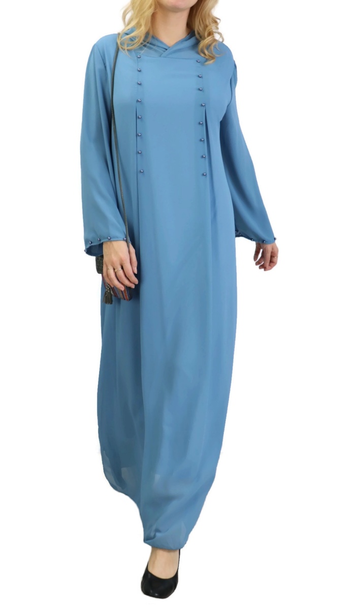 Robe longue fluide a capuche ornee de perles pour femme - Couleur Bleu clair
